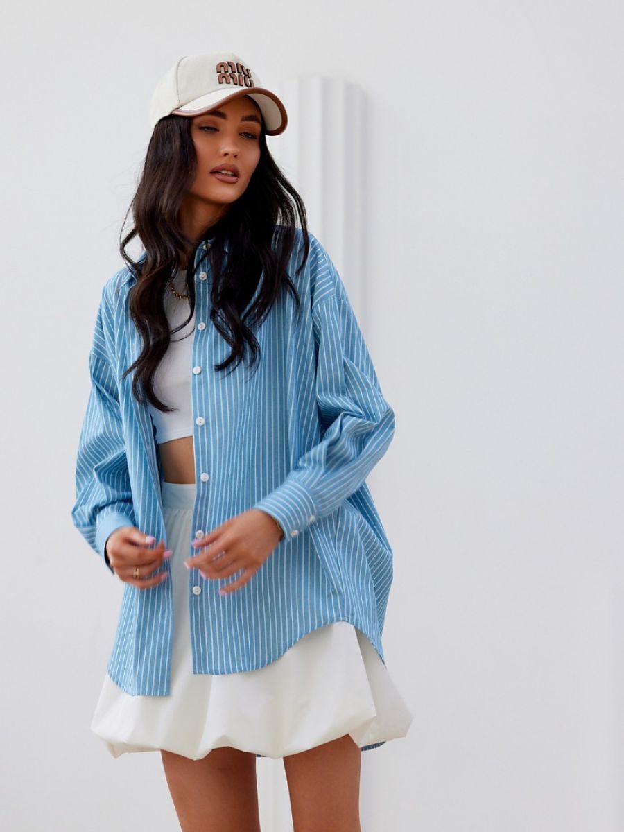 Oversized shirt with long sleeves finished with decorative cuffs buttoned up. It has an asymmetrical cut, buttoned up.