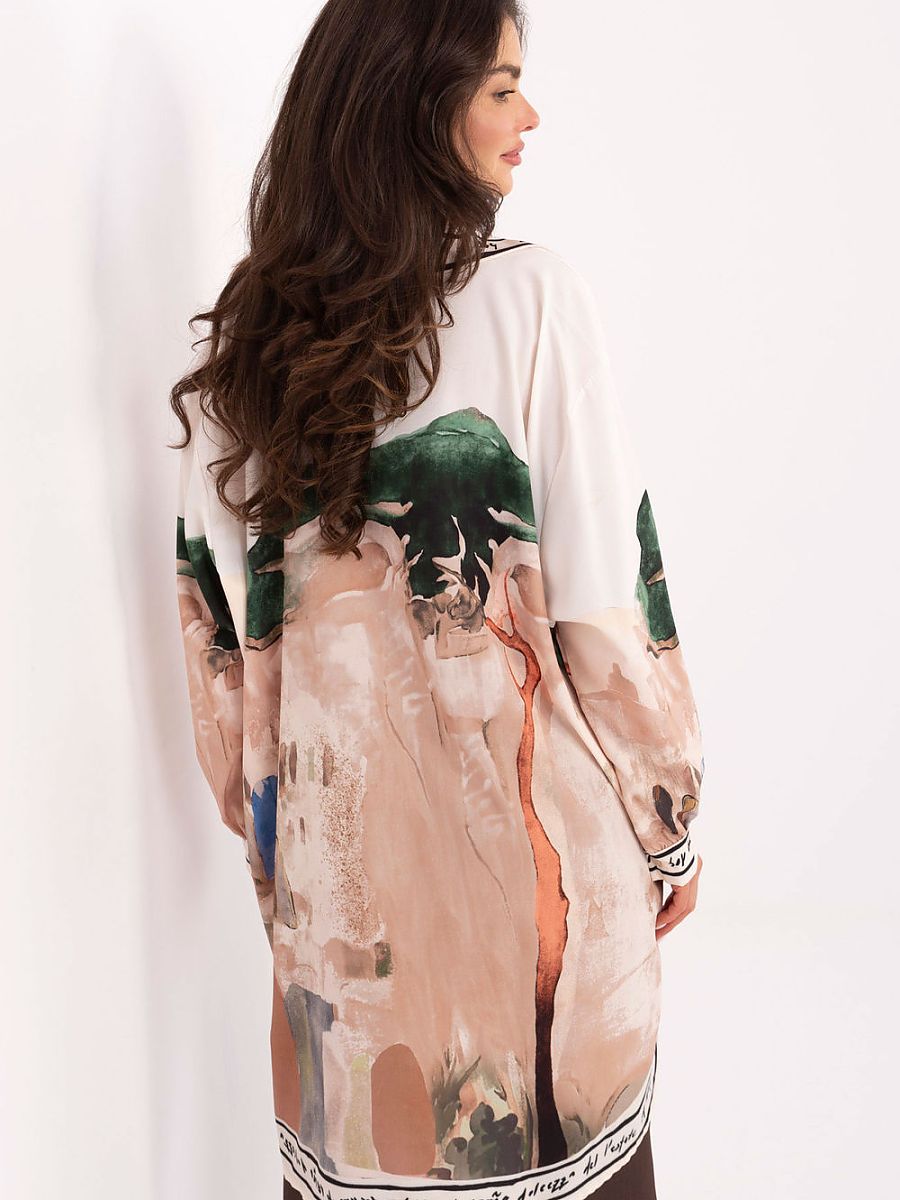 Women’s casual shirt, perfect for everyday wear and work. Made of a lightweight and pleasant to the touch blend of viscose and polyester, it guarantees comfort all day long. The longer cut model with a classic collar and long sleeves buttoned up, hidden under an elegant flap. The entire surface of the material is printed, with additional details in the form of inscriptions on the collar, flap, and around the bottom giving the shirt a modern, unique character. This is a proposal for women who appreciate comfort combined with original style.