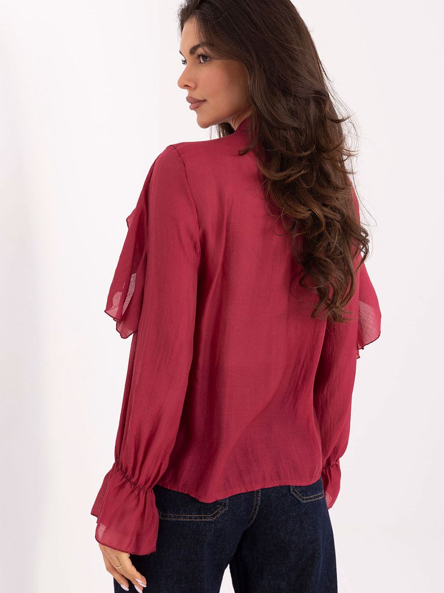 Classic women’s shirt in an elegant style, perfect for everyday wear, work, and formal occasions. Made of a blend of lyocell and polyester, it combines comfort, lightness, and durability. The standard length model with a V-neck and button fastening has been enriched with an eye-catching frill and subtle ruffles on the front, giving the whole a feminine, stylish character. Long sleeves finished with a ruffle emphasize the elegance and uniqueness of this proposal.