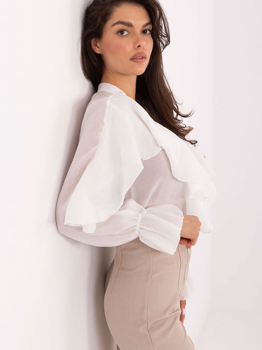 Classic women’s shirt in an elegant style, perfect for everyday wear, work, and formal occasions. Made of a combination of lyocell and polyester, it combines comfort, lightness, and durability. The model of standard length with a V-neck and button fastening has been enriched with a spectacular jabot and subtle ruffles on the front, which give the whole a feminine, stylish character. Long sleeves finished with a ruffle emphasize the elegance and uniqueness of this proposal.