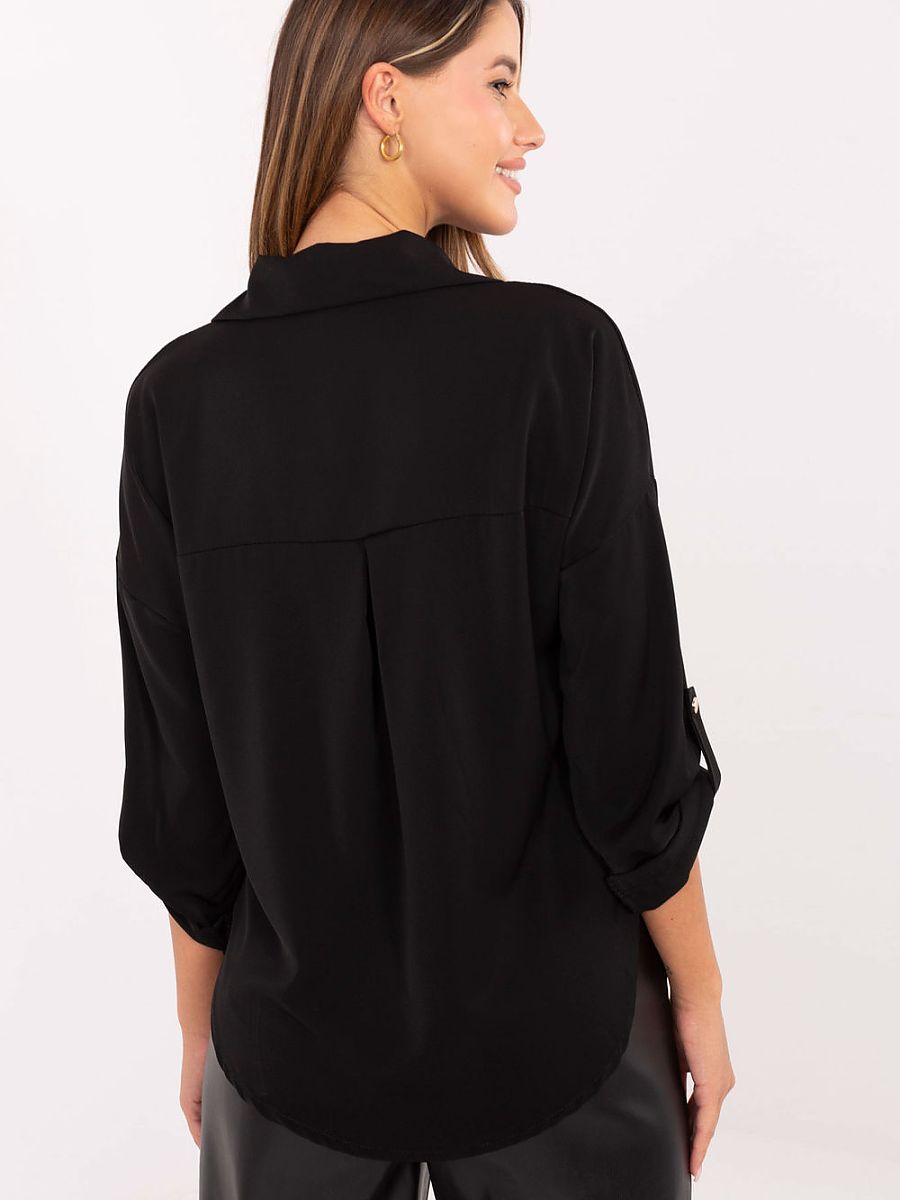 A classic women’s shirt with an elegant cut is an ideal choice for work, formal meetings, and everyday occasions. Made of high-quality blend of polyester, viscose, and elastane, it combines comfort with the durability and lightness of the material. The smooth pattern gives the shirt a timeless character, while the standard length and long sleeves with the option of rolling them up provide comfort and practicality. The shirt, buttoned up with a classic collar, is adorned with subtle, elegant brooches that add a touch of chic and feminine charm to the overall look.