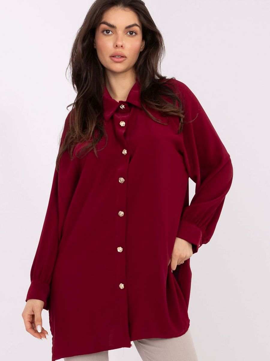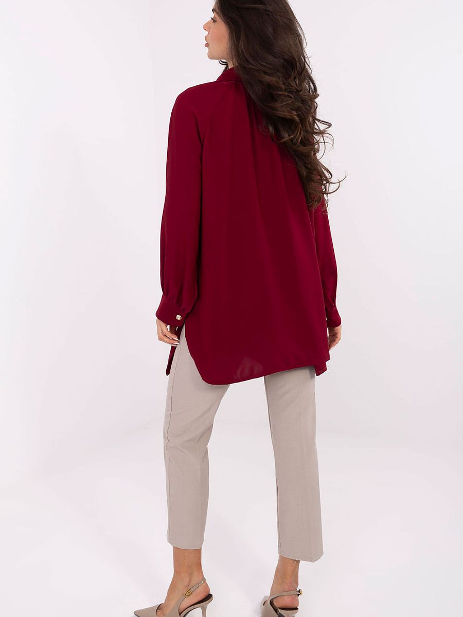 Classic women’s shirt in an elegant style is the perfect choice for everyday wear, work, and formal occasions. Its smooth pattern highlights the timeless character, and careful execution makes it work well in many different stylings. The model is made of lightweight, pleasant to the touch polyester, which drapes nicely on the silhouette. The elongated cut and subtle side slits give the shirt a modern look and provide freedom of movement. The shirt has long sleeves with delicate cuffs and puffy sleeves, which add a fashionable, distinctive accent to the whole. The classic collar and button closure emphasize the elegant character of the model. This stylish and functional shirt is ideal for women who appreciate the combination of classic with modern details.