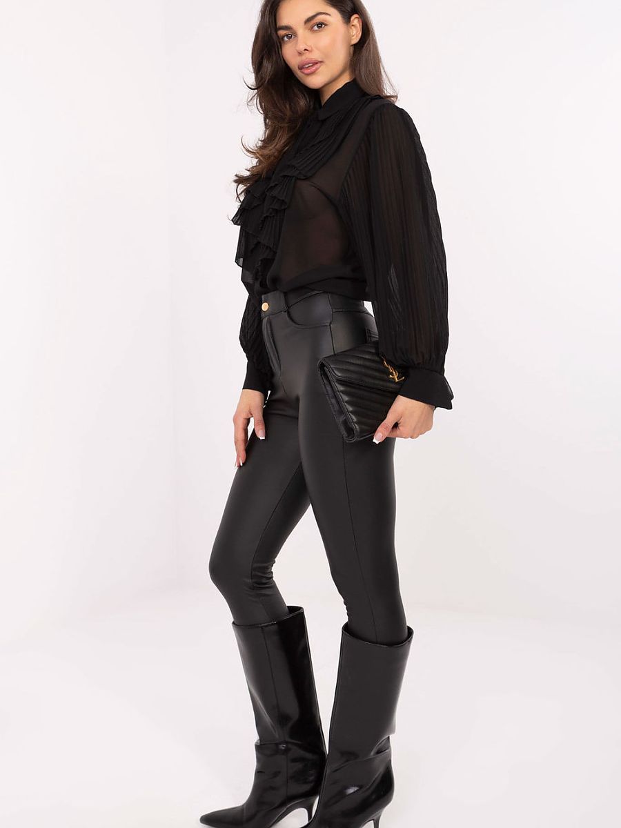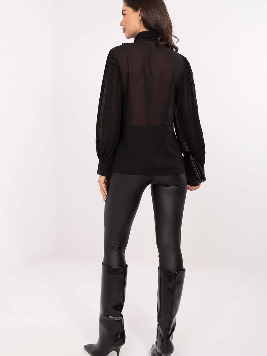 Stylish and feminine women’s shirt, which will work perfectly both for everyday wear, for work, and for formal occasions. Made of high-quality blend of polyester and elastane, it is light, flexible and pleasant to the touch, guaranteeing comfort throughout the day. The model has a classic collar and button fastening, which give it an elegant, timeless character. Attention is drawn to the pleated jabot with a tie at the front, which is an eye-catching, feminine accent. Long, pleated sleeves subtly enhance the overall look and add a unique class to the shirt. Thanks to the smooth fabric and standard length, the shirt looks great both paired with a skirt and trousers, creating a stylish outfit for the office or special occasions.