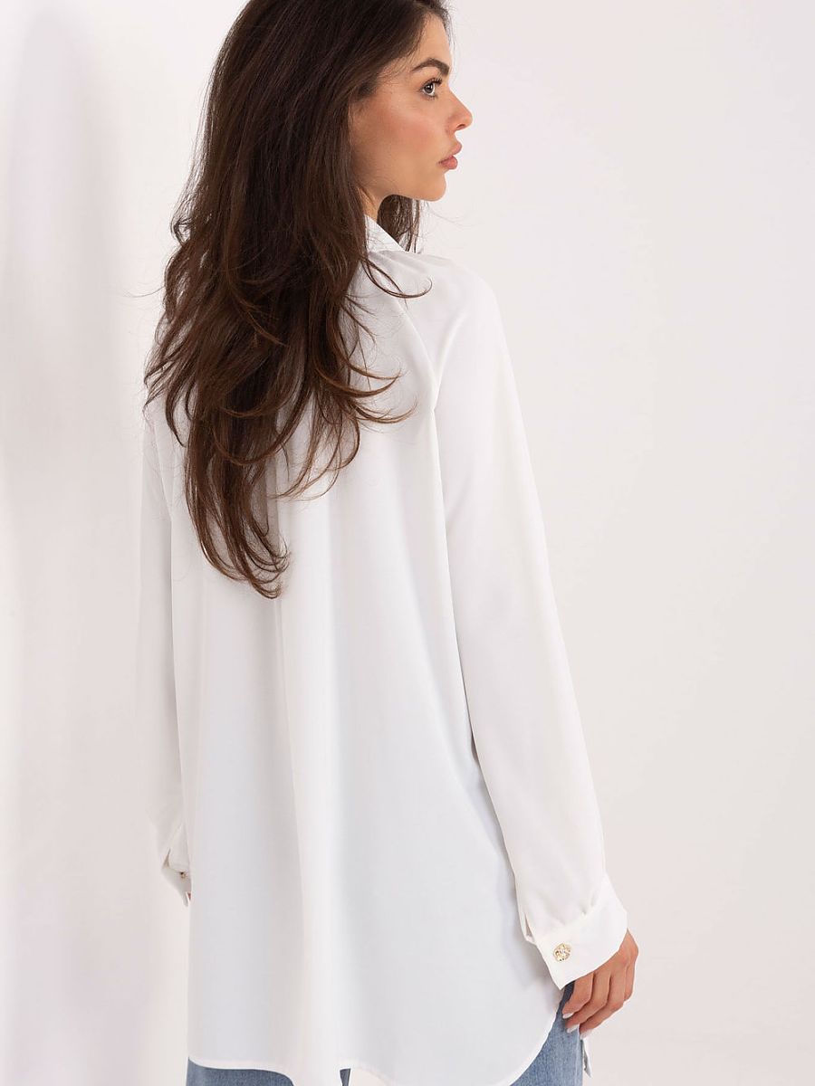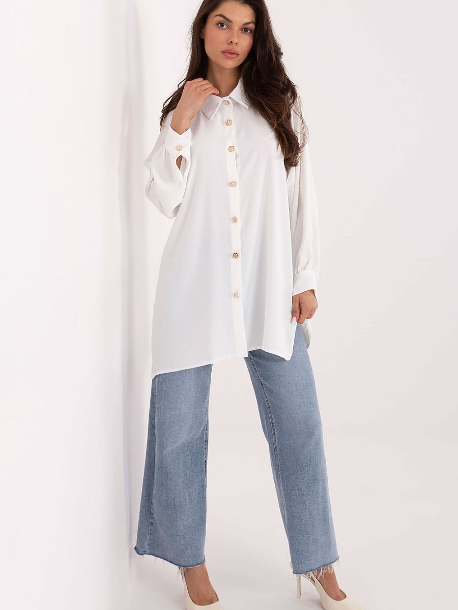 A classic women’s shirt in an elegant style is the perfect choice for everyday wear, work, and special occasions. Its smooth pattern emphasizes the timeless character, and careful execution makes it work well in many different stylizations. The model is made of lightweight, pleasant to the touch polyester, which fits well on the silhouette. The extended cut and subtle side slits give the shirt a modern look and provide freedom of movement. The shirt has long sleeves ending with a delicate cuff and puffy sleeves, adding a fashionable, striking accent to the whole. The classic collar and button closure emphasize the elegant character of the model. This stylish and functional shirt is ideal for women who appreciate a combination of classic and modern details.