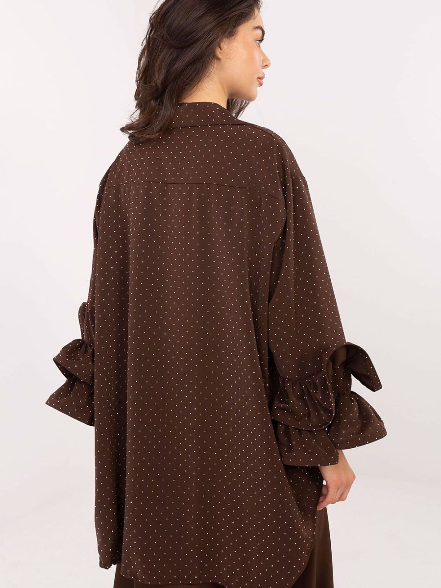 An elegant women’s shirt with an extended back is a unique model that combines a classic cut with a refined, party character. Designed in an elegant style, it will be perfect for formal occasions, ceremonies, banquets, as well as for evening outings and parties. The entire surface of the shirt is decorated with jet application, creating an impressive, shiny dominant pattern that adds a luxurious expression to the whole. The long cut with an extended back subtly slims the silhouette and looks extremely stylish. Made of a combination of cotton, elastane, and polyester, the shirt is comfortable to wear, flexible, and resistant to creases. The long sleeve finished with flounces introduces a feminine and slightly romantic accent, and the classic collar emphasizes the formal character of the model. The shirt is fastened with buttons, which allows you to adjust the depth of the neckline and makes it easier to put on. It is an ideal proposition for women who appreciate elegance but also like shine and modern finishes. Perfect for special occasions and stylish outings.