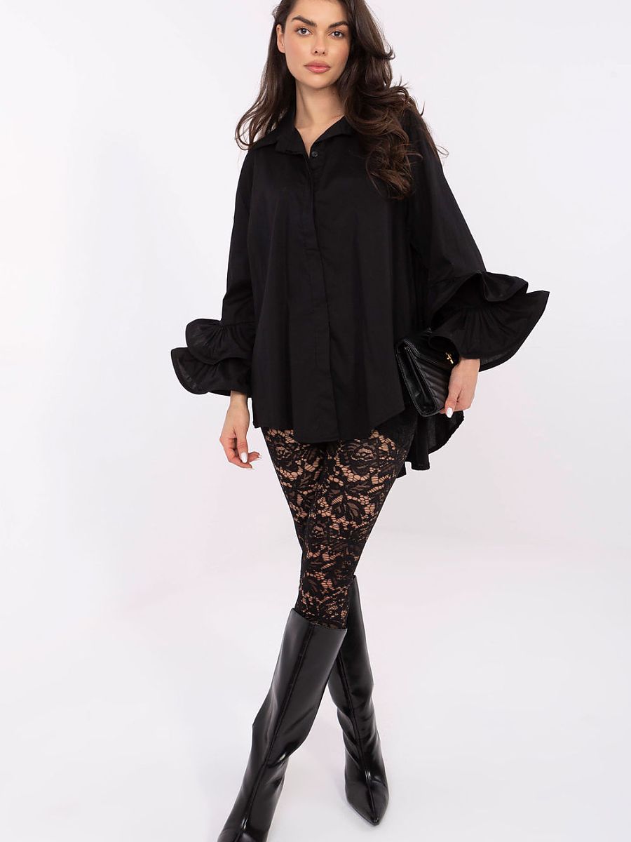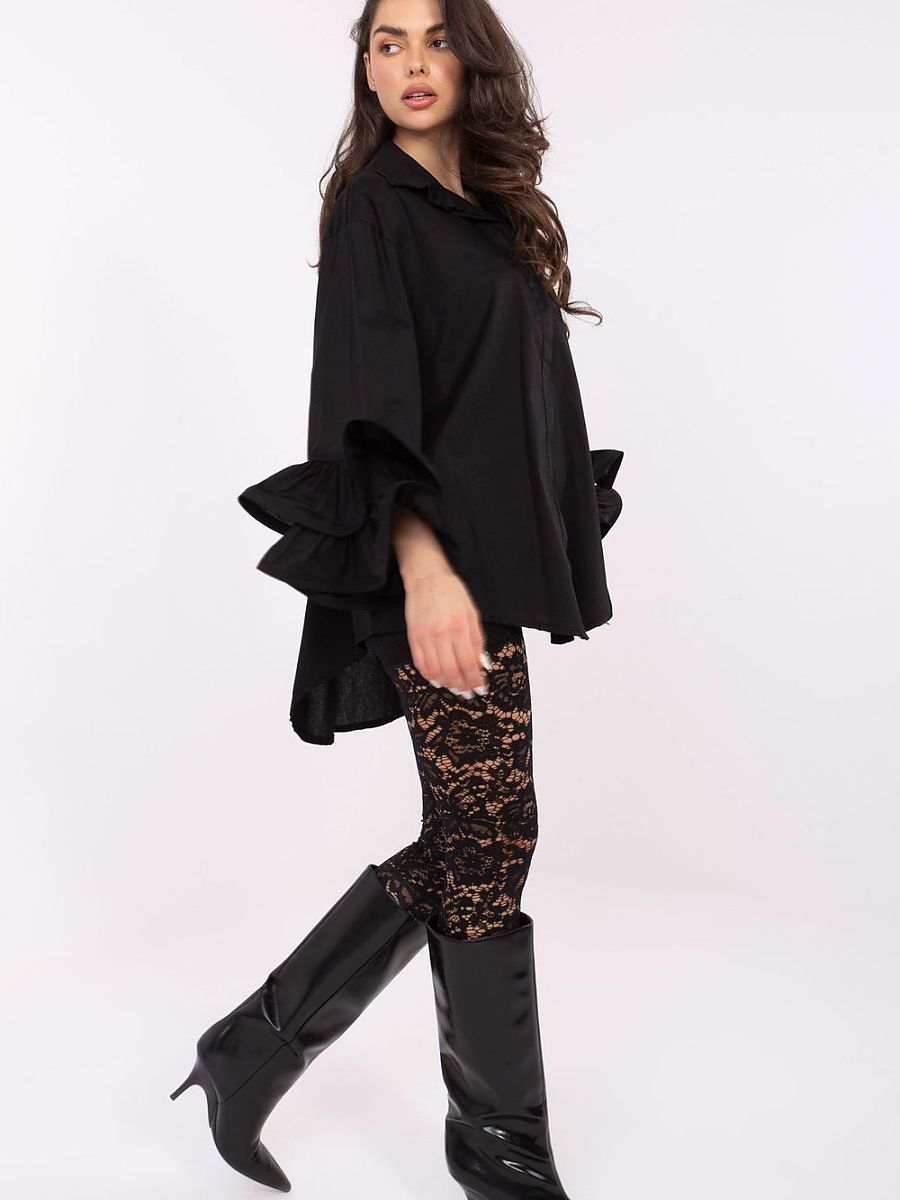 An elegant women’s shirt with a classic cut is a unique combination of style and comfort. Made of high-quality cotton, it provides breathability and comfort for all-day wear. The longer back of the model gives it a modern, slightly elongated silhouette and perfectly emphasizes the figure. The smooth, timeless pattern makes the shirt perfect for many occasions, for everyday stylizations, for work, for formal meetings or evening outings. The long sleeve finished with subtle ruffles adds delicate, feminine elegance to the whole look. The classic collar and button fastening emphasize the formal character of the shirt, making it an ideal choice for both an elegant blazer and as a stylish accent to an outfit.