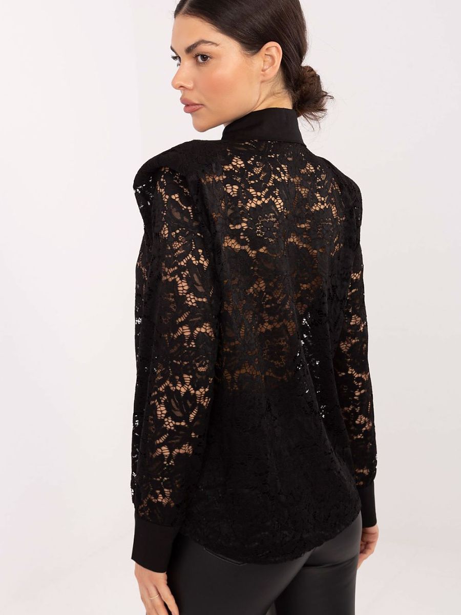 An elegant lace women’s shirt made of a delicate blend of polyester and viscose delights with its classic cut and subtle lace finish. Sewn shoulder pads give the silhouette sharpness and slightly emphasize the shoulder line, creating an aesthetic, elegant form. The standard length model will work perfectly for both work and formal occasions. The shirt has long sleeves and a classic collar, and the button closure emphasizes its timeless character. An additional decorative element is a stylish brooch that gives the whole a unique, elegant accent. Lace details add lightness and femininity, making this shirt the perfect choice for elegant stylizations.