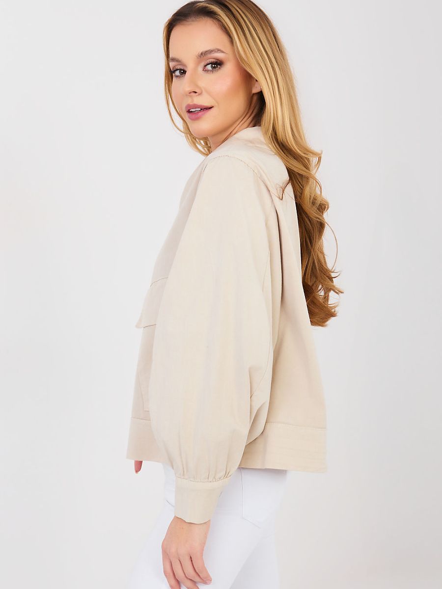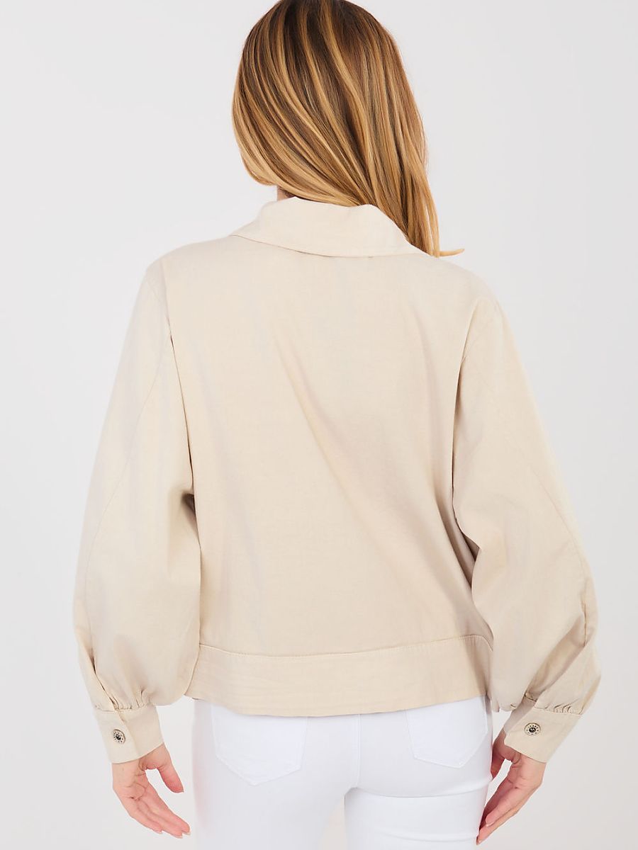 Women’s casual shirt is a stylish and comfortable proposal for everyday styling. The smooth cut makes the model universal and easy to combine with jeans, fabric pants or a skirt. The short length gives the shirt a modern character and perfectly emphasizes the silhouette’s proportions. The shirt is made of high-quality cotton with a touch of elastane, making it pleasant to the touch, breathable, and gently elastic. The model has a classic collar and button closure, accentuating its timeless style. Long, puffy sleeves add a feminine and trendy touch to the overall look. Practical and at the same time decorative elements are pockets with flaps placed on the front, complementing the casual character of the shirt.