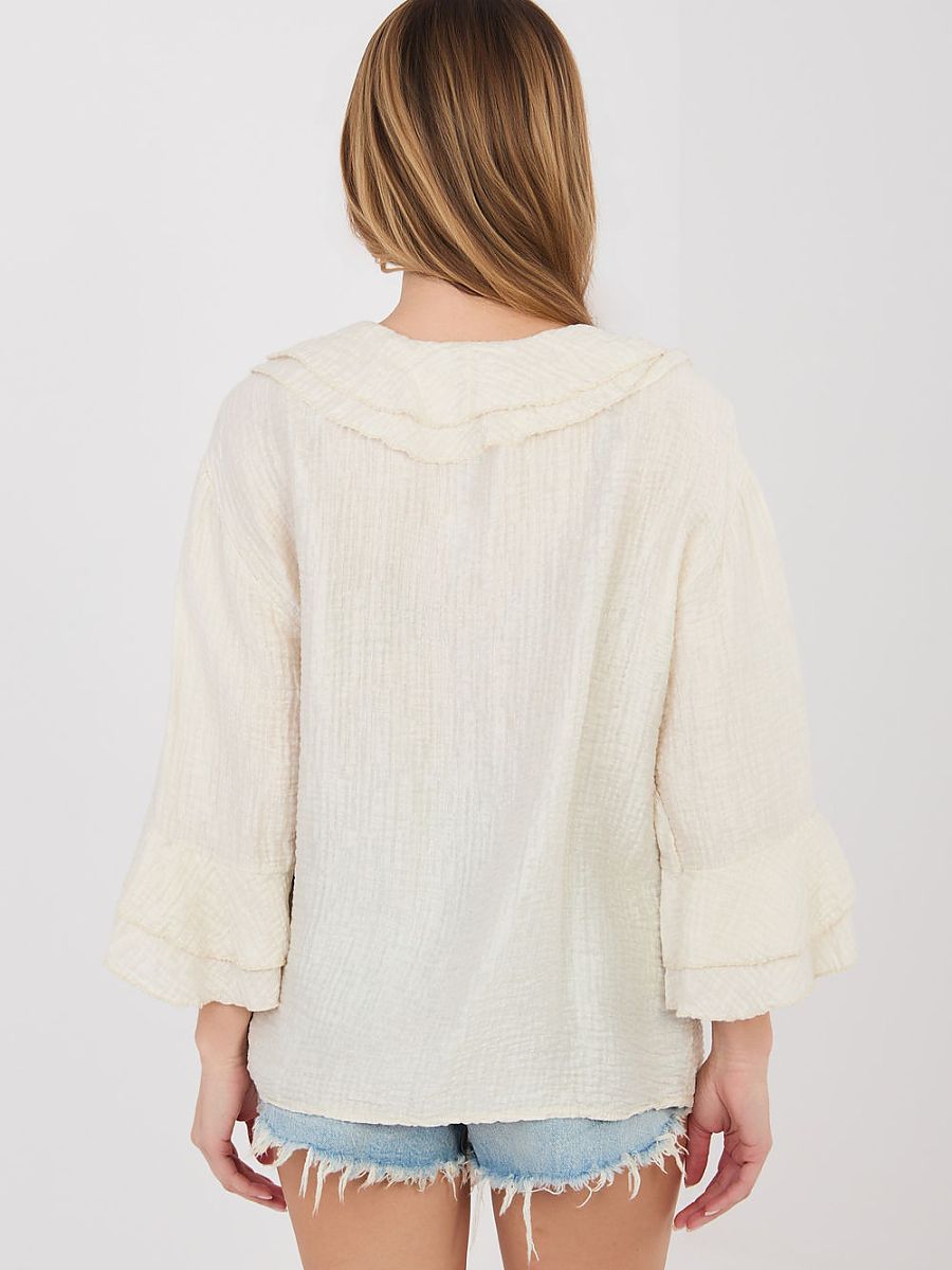 Women’s boho style shirt, which will work perfectly in both everyday stylizations and at work. The model stands out with a varied texture of the material, which gives the whole an interesting and stylish character. The shirt is made of lightweight and comfortable to wear fabric made of a combination of viscose and nylon. The material is breathable, gentle on the skin, and drapes well on the silhouette. The standard length allows you to wear the shirt both tucked into pants or a skirt, and loosely. The model has a V-neck with button fastening and an eye-catching ruffle collar. The front of the shirt is adorned with a decorative jabot, giving it a romantic character. The long sleeves are finished with subtle ruffles, emphasizing the lightness and feminine boho style. This is a unique proposition for women who appreciate comfort combined with original, fashionable design.