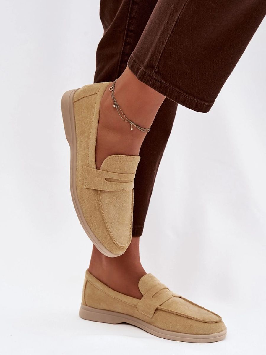 Stylish women’s moccasins made of soft eco-suede are a timeless proposal for everyday and more elegant stylizations. The classic cut makes the model universal and easy to match with both jeans and fabric trousers or a skirt. At the front, there is a characteristic strap with a subtle cutout, which gives the whole an elegant yet light character. Moccasins provide comfort and will work perfectly for everyday wear to work, for a walk or meetings. It is the perfect choice for women who appreciate simplicity, comfort, and timeless style.