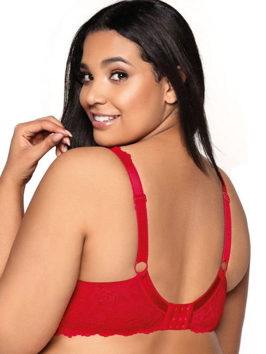 Phenomenal Carmela Big bra. Available in large sizes. Beautifully emphasizes the cleavage, perfectly collects the bust. Thanks to a wide, decorative strap it allows to hide breast asymmetries. The cups are made of fine red lace, which wraps the breasts sexily and gently creeps up the strap. Neat cups set on a lace bavette and lace back, which are reinforced with elastic mesh. Adjustable, non-removable straps. Double-breasted hook and eye closure with three-step adjustment.