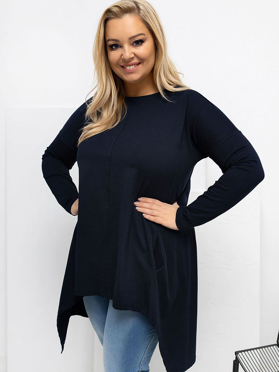 A plus size blouse with 3/4 sleeves and a sweetheart neckline.