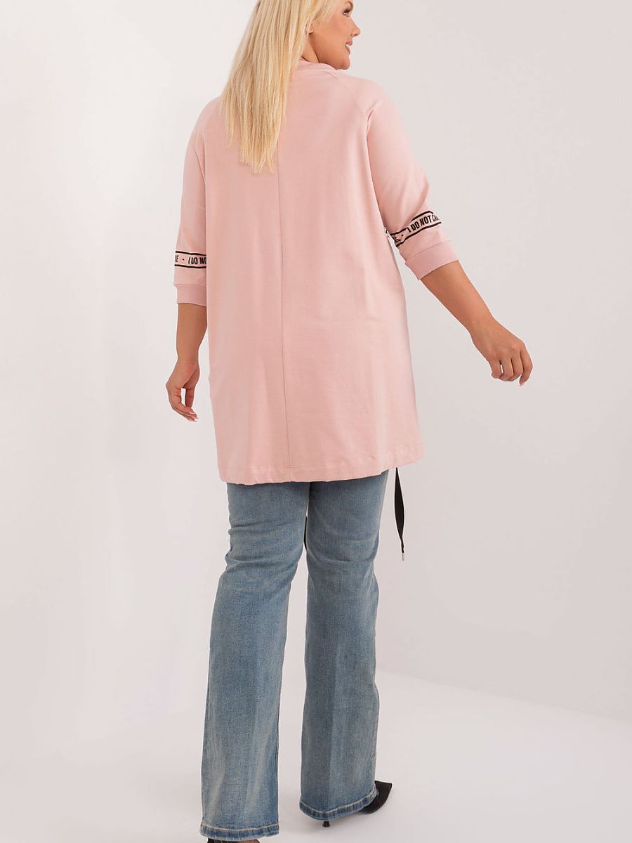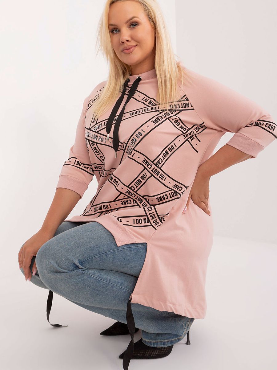 The asymmetrical plus size blouse is an everyday choice with a simple, dressy cut, ideal for everyday wear. Made of cotton with added elastane, it guarantees comfort and a lightweight fit. The extended cut and 3/4 sleeve ensure freedom of movement and comfort. The blouse has a round neckline, which adds a classic finish. On the front there are inscriptions decorated with rhinestones, which gives the blouse a fashionable and original character. Ideal for everyday styling, both for work and for looser outings.