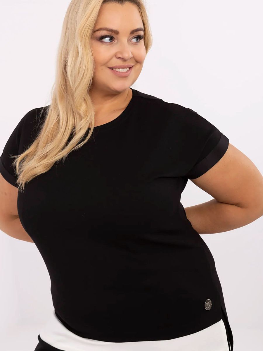 This everyday plus size blouse is a perfect combination of comfort and casual style. Made of exceptionally soft, pleasant to the touch material like “butter” (viscose with a mixture of elastane and polyester), it fits the body perfectly, providing comfort throughout the day. The smooth texture and classic, round neckline make the model suitable for many stylizations, while the standard length and short sleeves make it a practical choice for everyday wear. The contrasting insert at the bottom on the front adds a modern accent to the blouse and visually slims the silhouette. Without fastening, easy to put on and wear.