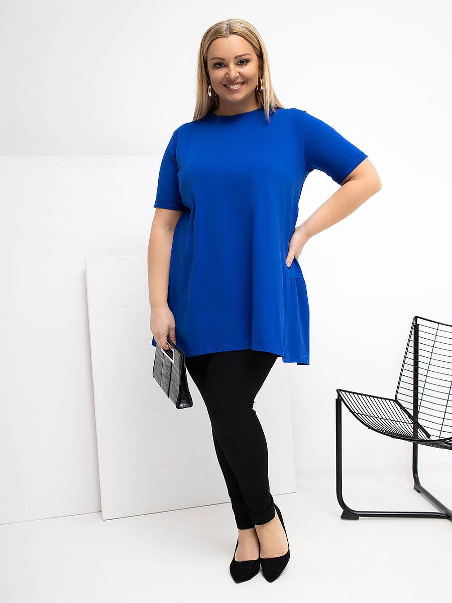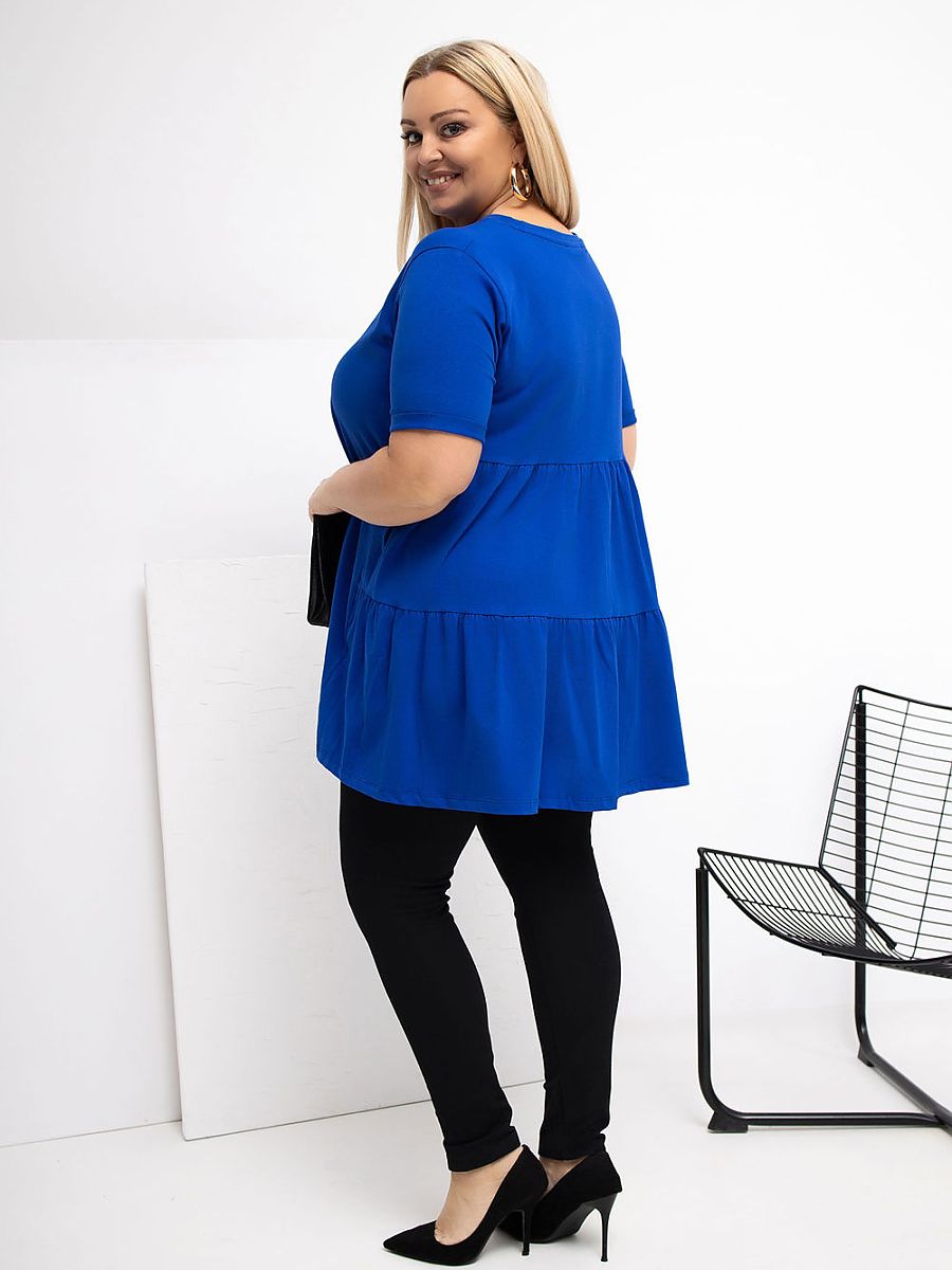 Extended casual top, perfect for everyday occasions. Made of soft to the touch cotton with elastane, making it soft, elastic, and comfortable to wear all day long. The smooth pattern makes the top easy to match with many outfits. The model has a round neckline and short sleeves, giving it a universal, relaxed character. The lack of fastening emphasizes the simple, comfortable form. An additional advantage is the frill at the bottom back, which subtly enlivens the silhouette and adds a feminine charm. An ideal proposition for everyday wear with jeans, leggings, or a skirt.
