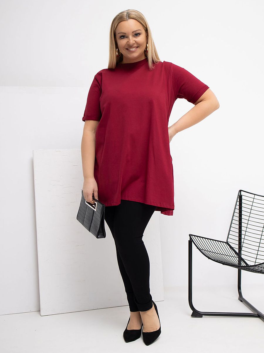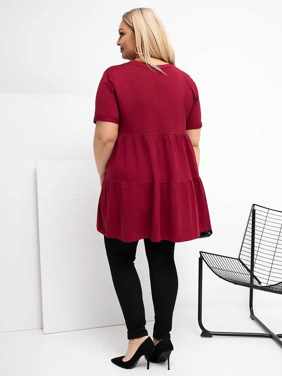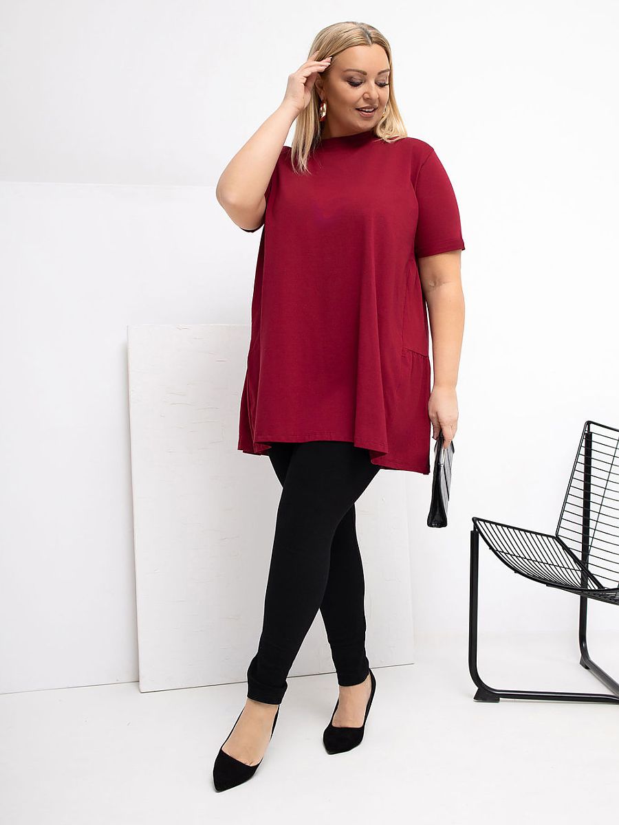 Extended casual blouse, perfect for everyday occasions. Made of soft to the touch cotton with elastane, making it soft, stretchy, and comfortable to wear all day. The smooth pattern makes it easy to match with many styles. The model has a round neckline and short sleeves, giving it a universal, casual character. The lack of fastening emphasizes the simple, comfortable form. An additional advantage is the ruffle at the back bottom, which subtly enlivens the cut and adds a feminine charm. An ideal proposal for everyday wear with jeans, leggings, or a skirt.