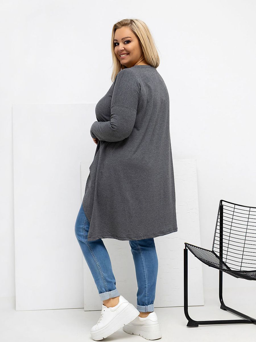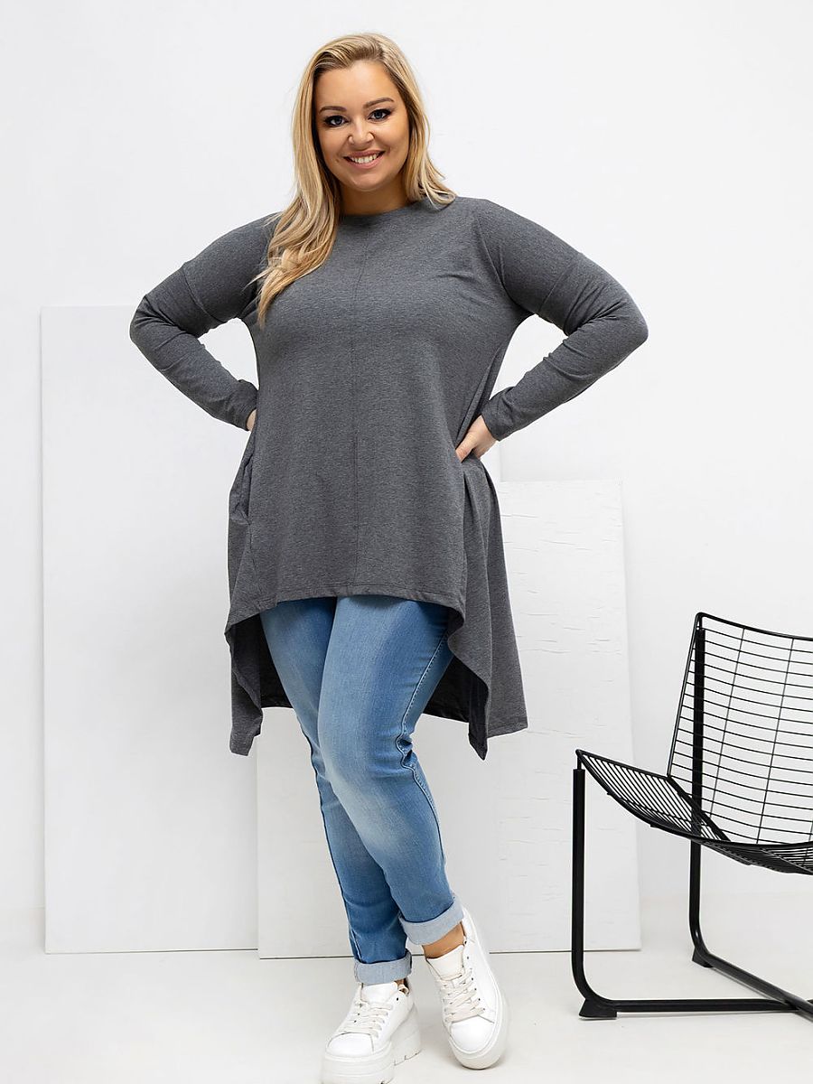 An asymmetrical plus size casual blouse is the perfect everyday proposition, combining comfort with a fashionable look. The model with a shorter front and longer back subtly slims the silhouette and provides freedom of movement. The smooth cut makes the blouse versatile and easy to style, it will work great with both jeans and leggings. Made of high-quality cotton with added elastane, it is soft, breathable, and flexible, making it perfectly fit the figure. Long sleeves and a classic, round neckline emphasize its everyday character. The practical advantage is the pockets hidden in the side seams, which add functionality and a modern touch. The blouse has no fastening, which increases comfort and emphasizes its loose, relaxed style.