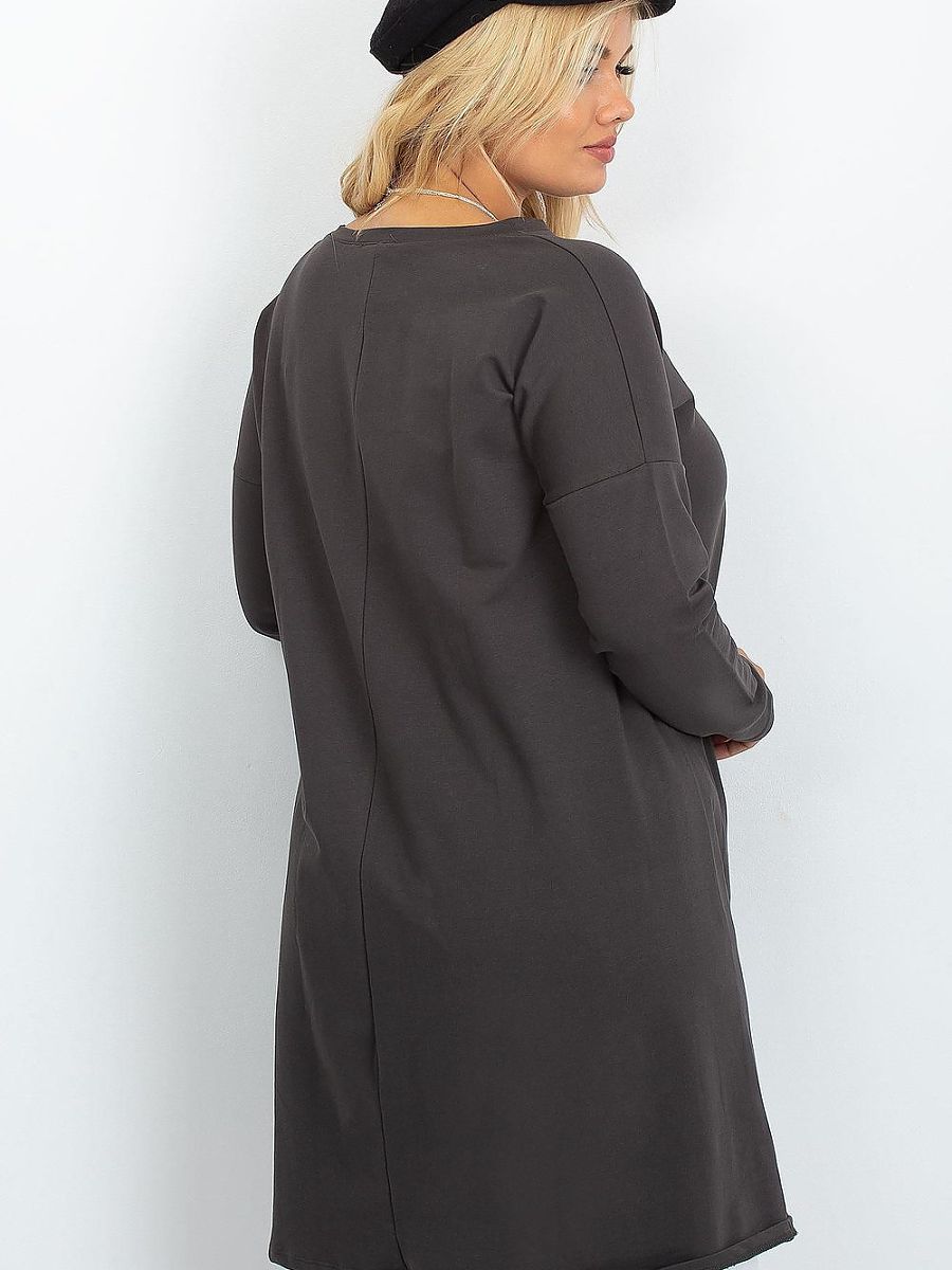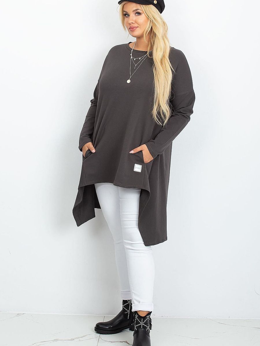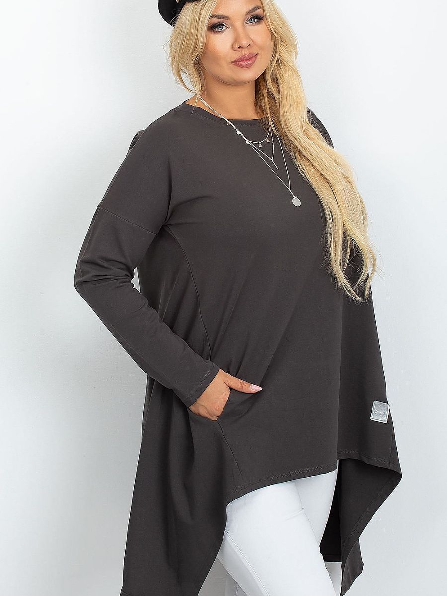 Stylish plus size tunic with extended, asymmetrical cut is a perfect proposal for women who value comfort and modern look. Made of soft, pleasant to the touch material, it beautifully drapes on the silhouette, providing freedom of movement and subtle slimming effect. The model combines the tunic style with an asymmetrical dress, making it perfect for leggings as well as a standalone, loose dress. Classic, round neckline accentuates the neck and matches any styling. Long sleeves, perfect for cooler days. Practical pockets hidden in the side seams add convenience and functionality. At the front, at the bottom, there is a small patch adding a trendy character to the whole piece. The tunic is put on over the head, ensuring quick and comfortable putting on. Modern, comfortable, and stylish, it will perfectly complement everyday outfits, and its extended, asymmetrical cut will beautifully highlight the advantages of the plus size silhouette.