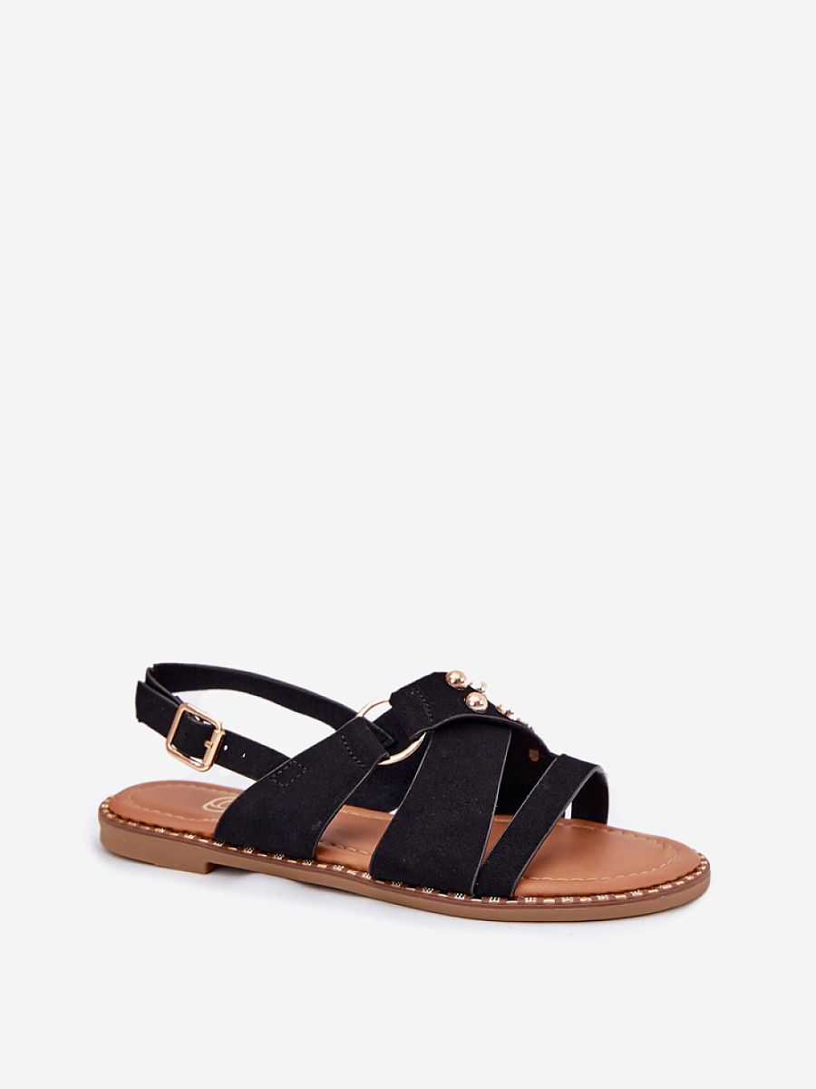 Women’s sandals made of faux suede are a stylish proposition for warm days. The flat heel ensures comfort with every step, and decorative gold studs add a unique character to them. Fastened with a buckle with an adjustable strap, they perfectly fit the foot, ensuring confidence and stability while walking. Perfect for everyday stylings as well as for more elegant occasions, they go well with dresses, skirts, or pants in summer outfits.