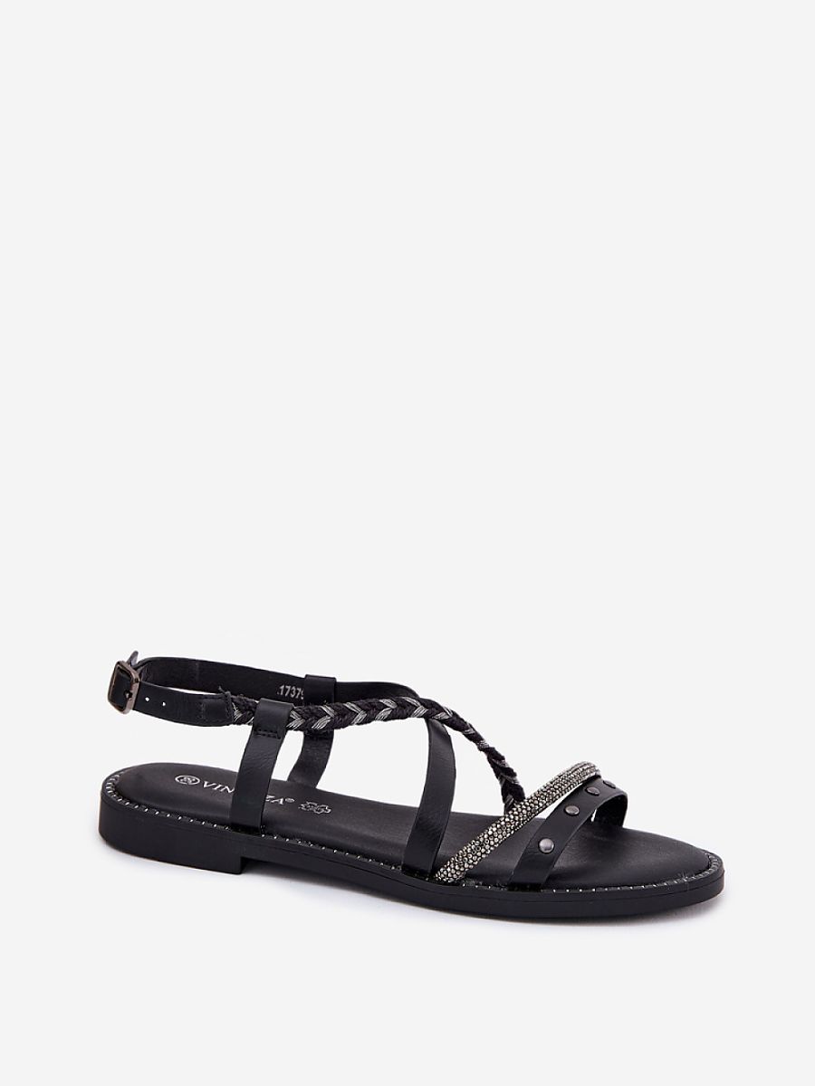 Women’s sandals made of eco leather are a stylish and comfortable option for warm days. Set on a flat heel, they provide comfort throughout the day. This model stands out with decorated straps at the front and one braided strap that adds a unique character to them. Fastened with a buckle with an adjustable strap, they allow for a perfect fit to the foot. The soft, leather insole ensures comfort, making these sandals an excellent choice for everyday summer stylings.