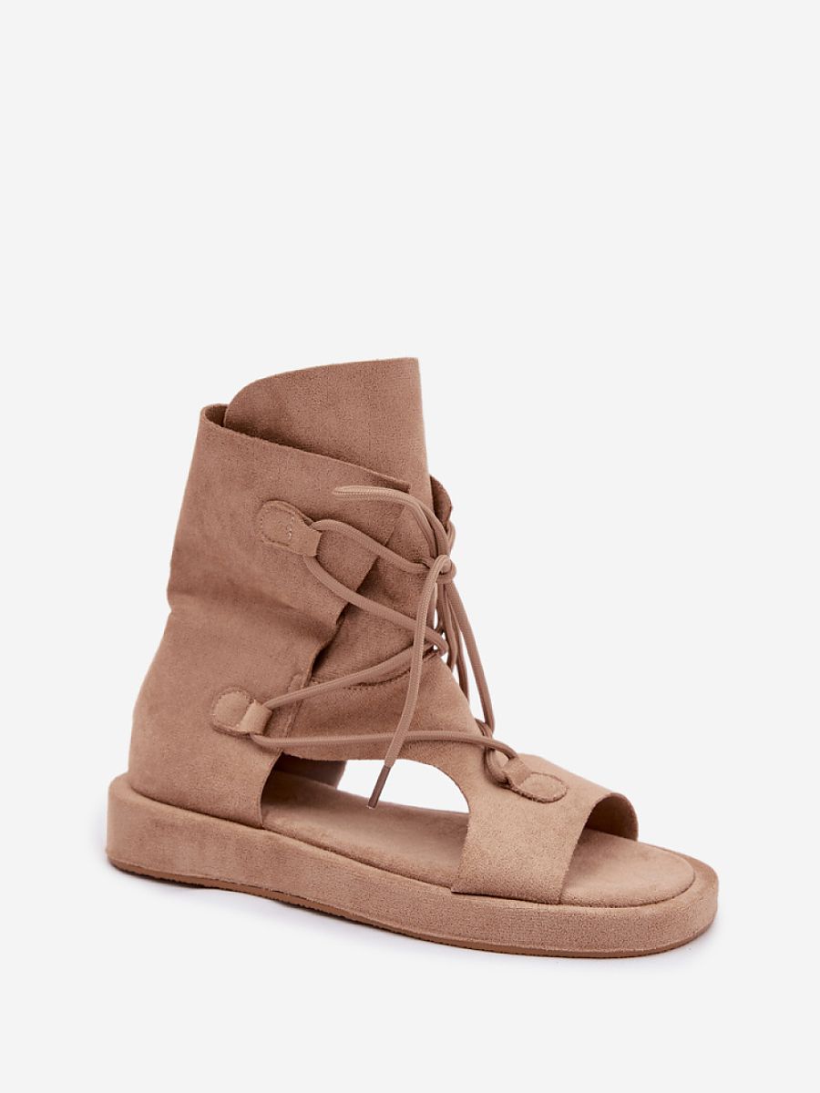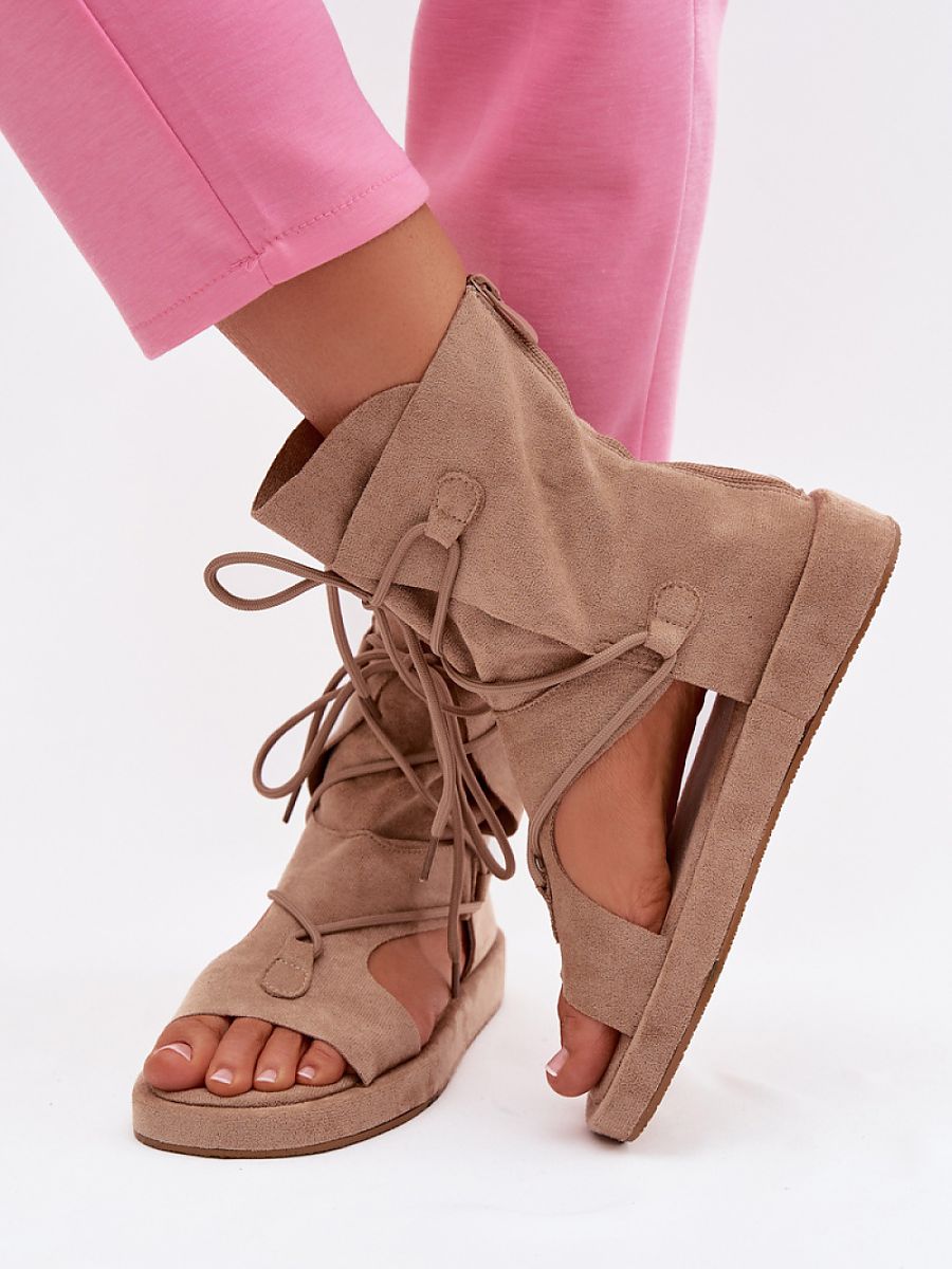Stylish women’s sandals made of eco-suede are the perfect choice for summer days. The model with a high upper ensures a good fit and a stylish look, while the lacing at the front adds a stylish accent. The zipper closure at the back makes it easy to put on and take off the shoes quickly. These sandals go perfectly with summer dresses and boho-style skirts, creating light and fashionable outfits.