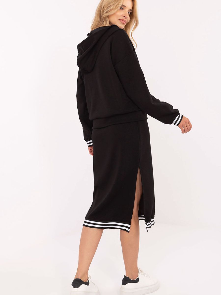 The casual women’s set is an ideal proposition for everyday wear, combining comfort and a feminine character. Made of buttery material (viscose with elastane), it impresses with its softness, delicacy, and exceptional touch pleasure. The hoodie with a zipper has long sleeves, practical slip pockets, and decorative ribbing at the cuffs, giving the whole a sporty accent. The midi-length dress with decorative finishing, thick straps and a sweetheart neckline, perfectly complements the hoodie, creating a cohesive and fashionable look. The set will work well in everyday outfits, guaranteeing comfort and freedom of movement, while also providing a stylish and modern appearance.