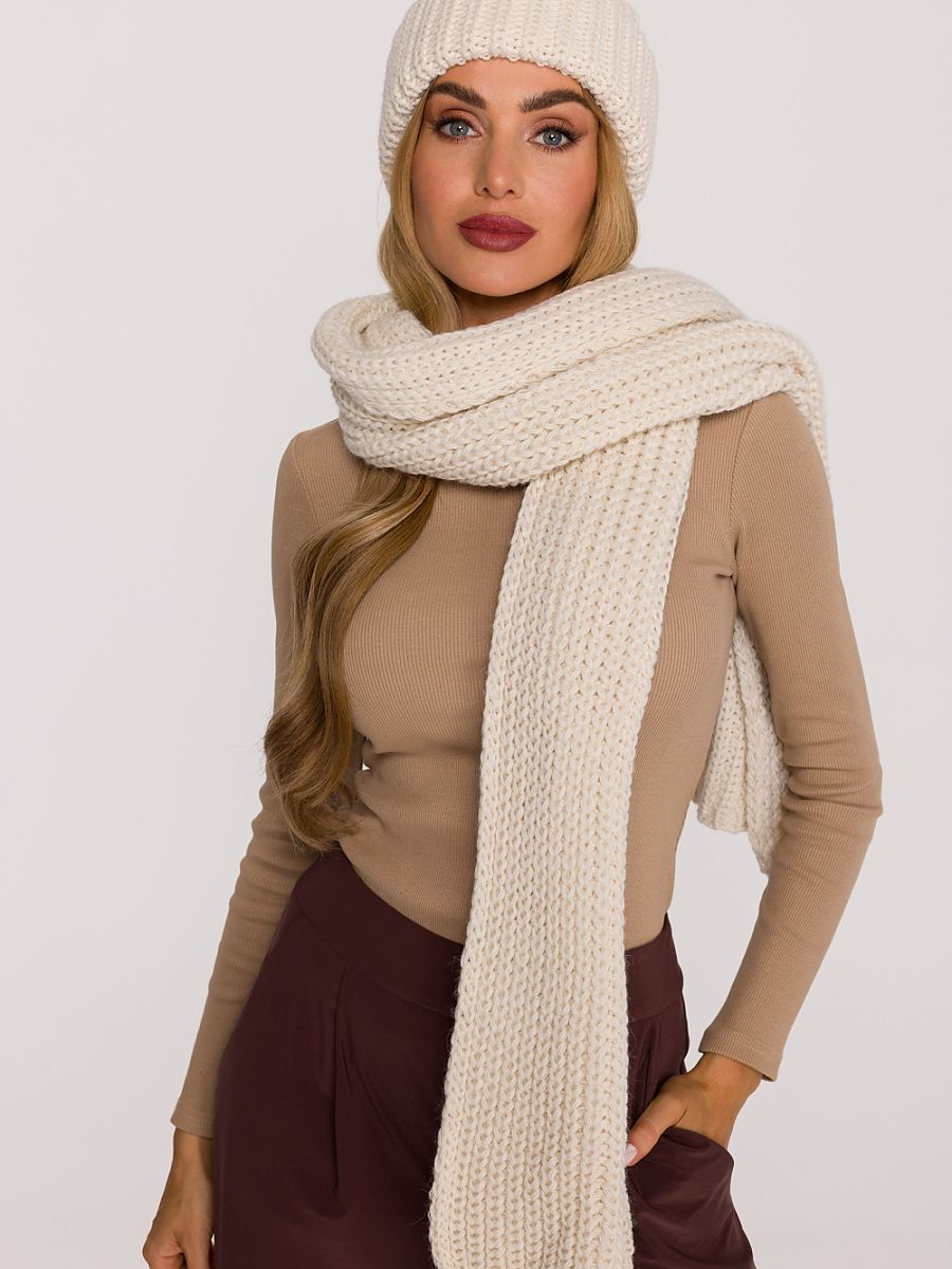 A long, simple scarf made of soft yarn with a thick, ribbed weave. Wide and enveloping, it provides pleasant warmth and comfort on cold days. With its dimensions of 170 cm length and 45 cm width, it will be perfect for both everyday and more elegant stylizations.