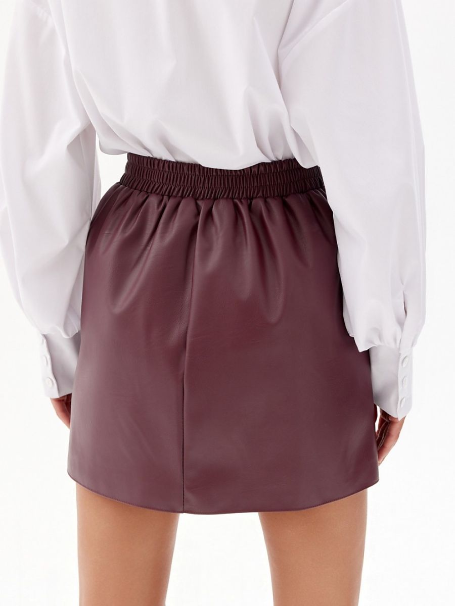 The Jackie skirt is made of a leather-like material, which is perfect for the autumn-winter season. The skirt was made in a trapeze shape, which looks good on any figure. The reinforced waist belt beautifully emphasizes the waist, and the mini length exposes the legs. An elastic band has been sewn into the back, which ensures a perfect fit and guarantees comfort. An additional asset of the skirt are pockets located on the sides. The skirt has a sewn-in lining. Jackie skirt will look great in autumn-winter styling with a voluminous oversize sweater and massive lace-up trappers, as well as in a more elegant look, combined with a shirt and boots on a pole. A large bag and a warm scarf will be a stylish complement to the whole look. The leather skirt is an excellent option for various occasions, from everyday meetings to elegant outings. The product is manufactured and sewn in Poland.