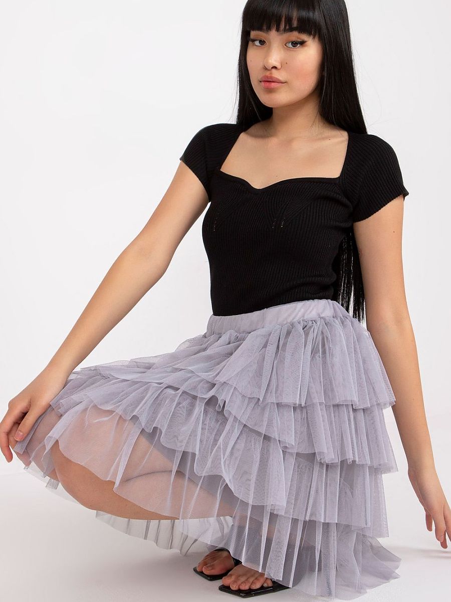 Tulle skirt with ruffles is an elegant proposal that will add lightness and feminine charm to any outfit. Made of high-quality polyester and viscose blend, it provides comfort and beautifully drapes on the silhouette. The skirt has a smooth pattern and a mini length that accentuates the legs and gives the whole outfit a subtle yet distinctive character. Layers of tulle with delicate ruffles create a spectacular finish, perfect for special occasions such as parties, weddings, or evening outings. The model is equipped with a lining that guarantees comfort and ensures full freedom of movement. The lack of fastening makes the skirt easy to put on and wear, and the elastic waistband (if present) further enhances comfort. It is a perfect choice for women who appreciate elegance in a fashionable way.
