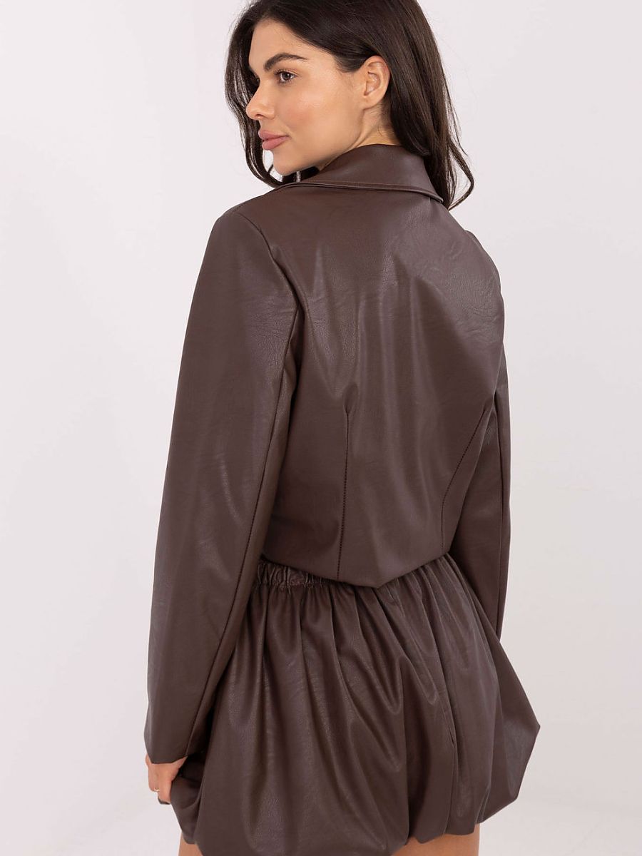 Casual bubble skirt made of imitation leather in a mini length, perfect for everyday styling. Made of a blend of polyester and polyurethane, the smooth surface gives it a modern and fashionable character. An elastic band is sewn into the waist, providing a comfortable fit, and there are shorts sewn underneath the skirt, guaranteeing full freedom of movement and comfort. The model has a lining, which further enhances comfort and ensures the material is perfectly arranged. The skirt has no closure, making it easy to put on and giving it a light and casual look. This is a proposal for women who appreciate the combination of comfort, urban style, and a striking leather finish.