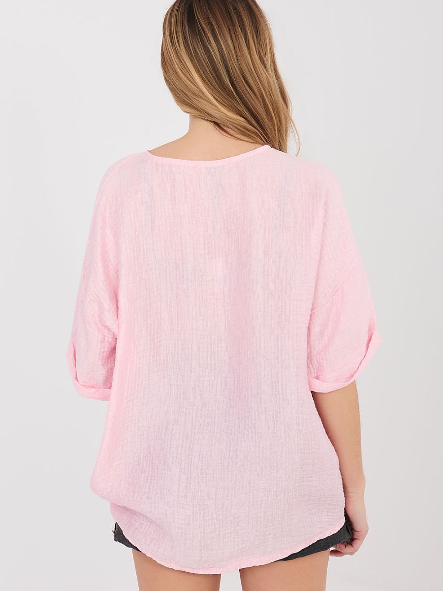 Women’s shirt with a light and comfortable cut, perfect for everyday styling. Made of pleasant to the touch fabric consisting of a blend of viscose and nylon, thanks to which the material is breathable, light and fits well on the silhouette. The model is distinguished by a varied texture of the material, which gives the shirt an interesting and stylish character. The shirt does not have a collar, and the V-neck subtly emphasizes the neckline and adds a feminine lightness to the whole. Short sleeves make the model perfect for warmer days. The standard length allows you to wear the shirt both tucked into trousers or a skirt, and loosely. The button closure is practical and makes it easier to put on, while also being a classic finishing element.