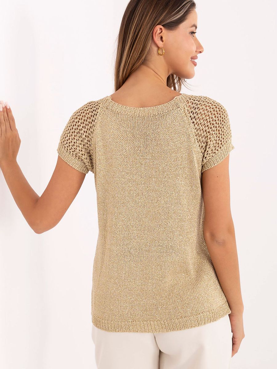 Stylish and subtly elegant women’s sweater is the perfect choice for everyday wear and work. Made of a pleasant to the touch material viscose with a hint of metallic fiber, it gently shines, giving the outfit a unique character, while maintaining comfort and lightness. A standard length model with short sleeves and a classic round neckline will work well in office outfits as well as in more casual sets. A model that you can easily match with pants, a skirt or elegant material shorts. This sweater combines elegance with everyday comfort, adding a shine to every outfit without exaggeration.