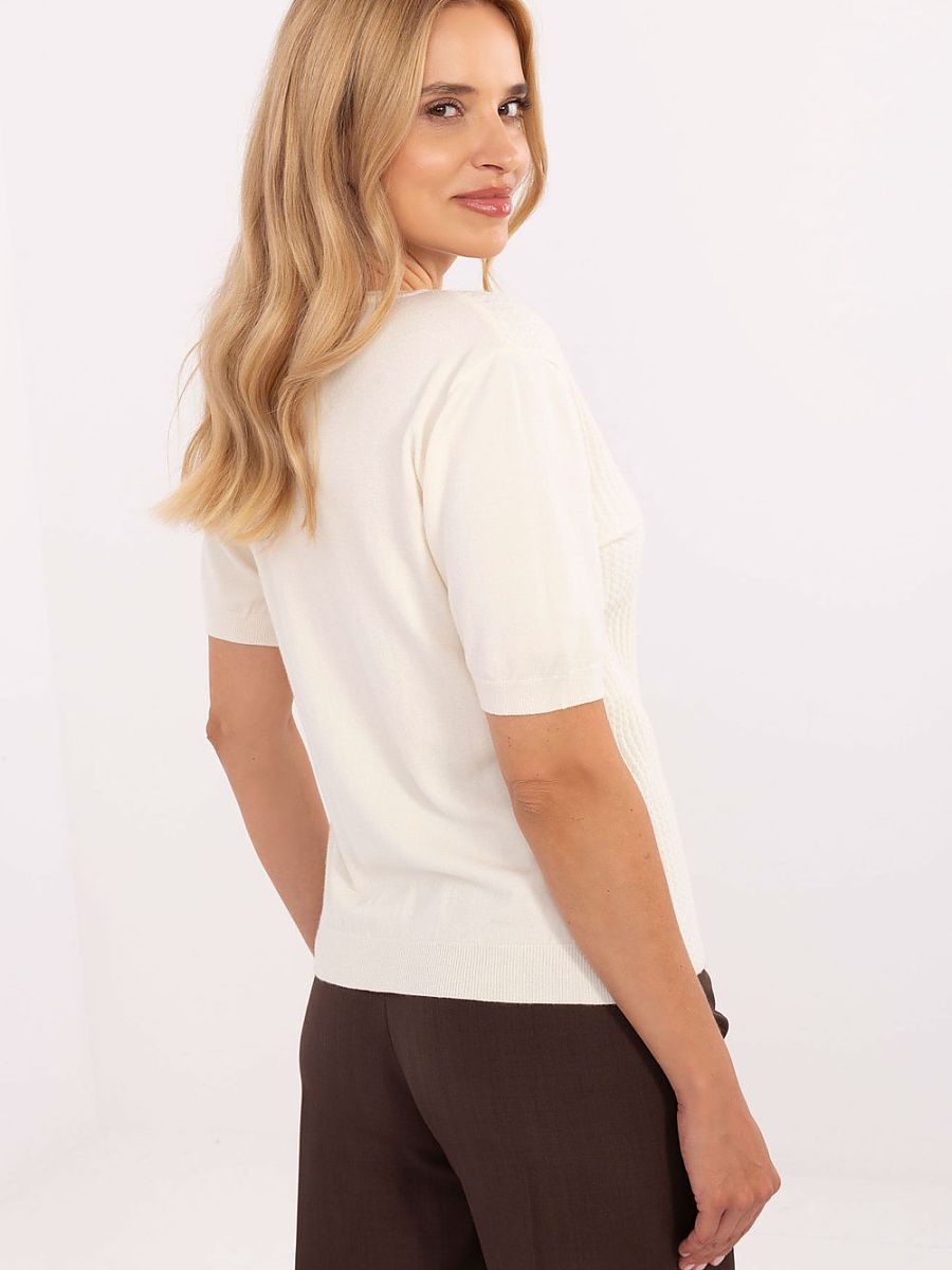 An elegant women’s sweater with short sleeves is a stylish proposal for work and everyday wear. Made of a soft blend of viscose, polyester, and nylon, it ensures comfort and an elegant look. The standard length sweater has a v-neckline adorned with a subtle chain, and the front is decorated with a varied texture of the material, adding character and unique style. Perfect for pairing with both skirts and elegant trousers, creating fashionable daily or office outfits.