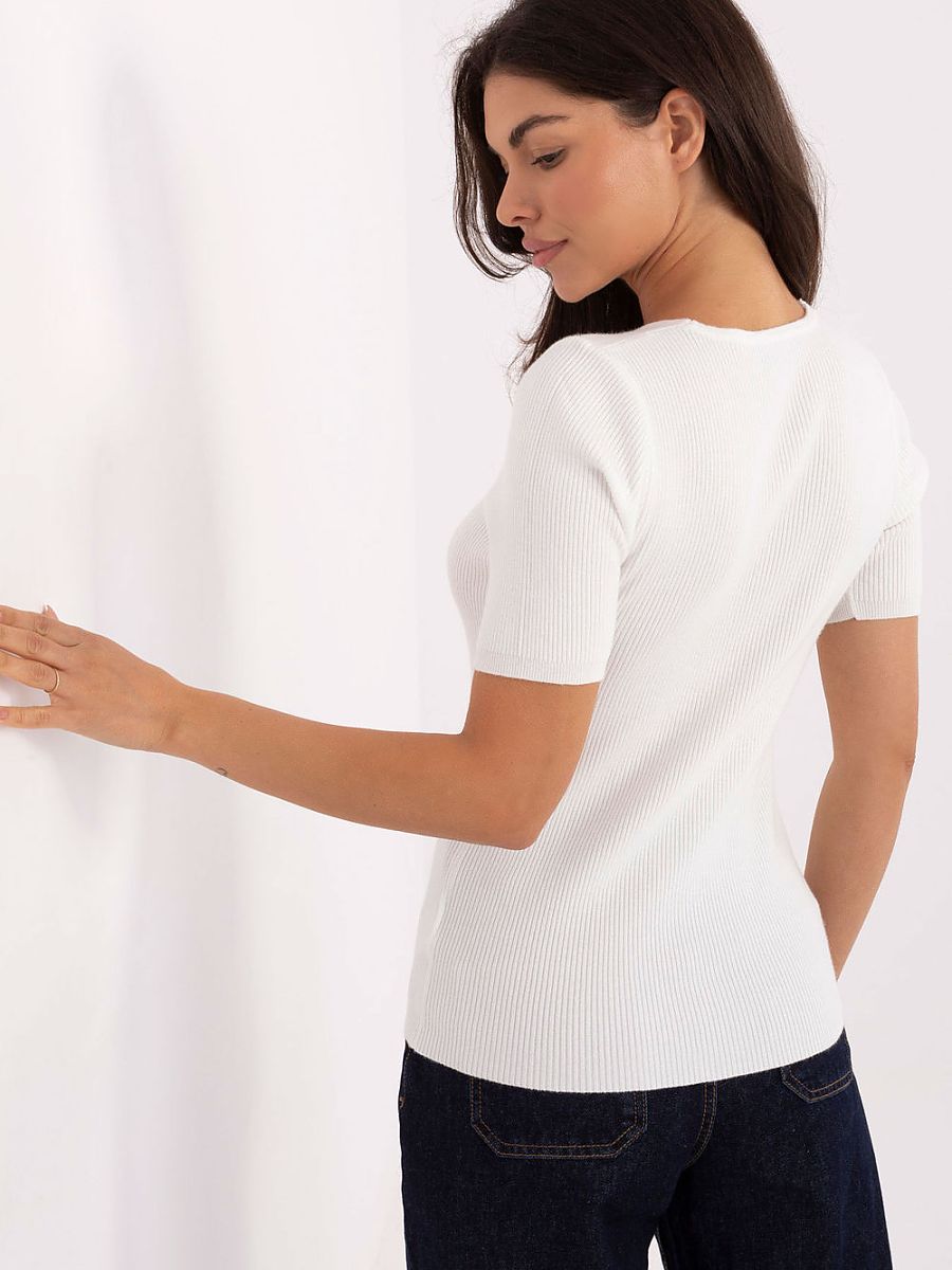 Stylish women’s sweater made of a flexible blend of viscose, polyester, and polyamide, which ensures comfort and freedom of movement. The model has a standard length and short sleeves, and the V-neck subtly emphasizes the neckline. The sweater made of ribbed material, maintained in a smooth, dominant pattern, will work great in casual, everyday, and work outfits. It is a versatile wardrobe item that can easily be paired with both jeans, skirts, or trousers.