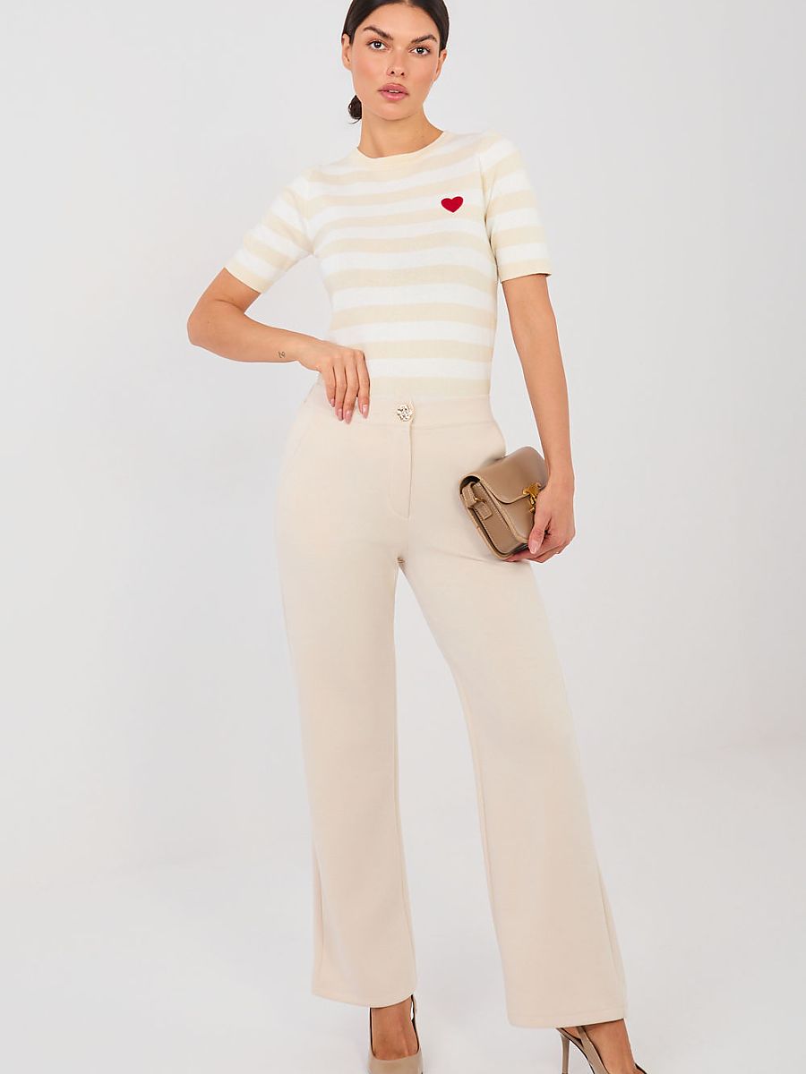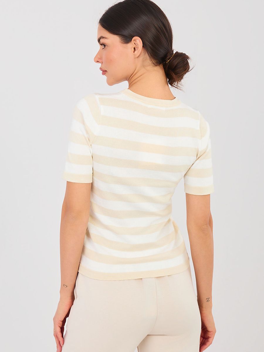 Stylish women’s striped sweater is the perfect choice for women who appreciate comfort and trendy, casual style. The classic striped pattern gives it a timeless character and makes it fit perfectly into everyday outfits. The standard length model fits well on the silhouette, and the short sleeves provide comfort, especially on warmer days or as part of layered outfits. The round neckline emphasizes the versatile character of the sweater and makes it suitable for both jeans, skirts, or elegant trousers. The sweater is made of high-quality blend of viscose and polyester, making the material soft, pleasant to the touch, and resistant to creases. A charming accent is the embroidered heart at chest height on the left side, adding a subtle, feminine character to the whole. It is a perfect choice for everyday wear to work, meeting friends, or a walk.