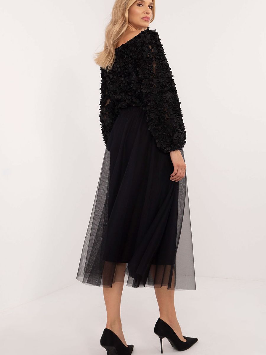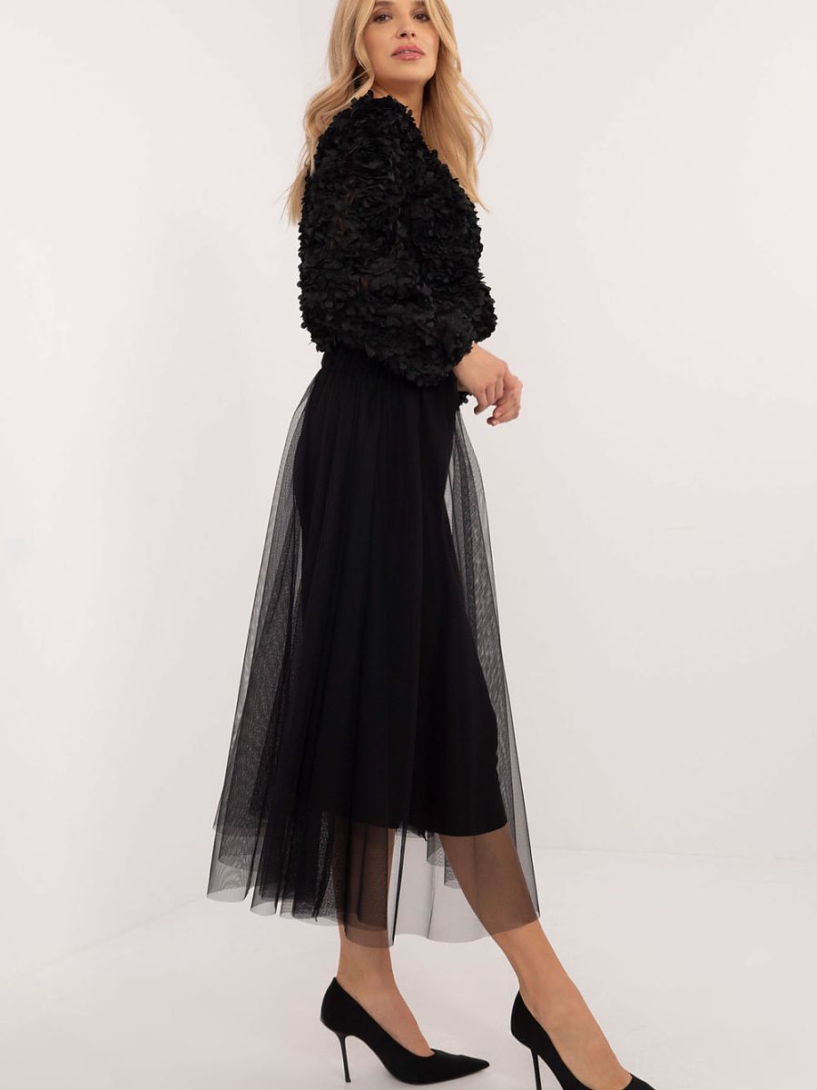 A midi length flared tulle skirt, perfect for everyday wear and events, combining casual style with a touch of elegance. Made of lightweight polyester, the skirt features a smooth pattern that gives it a subtle and versatile feel. The tulle material combined with the flared cut creates a light and airy effect, perfect for a variety of occasions. The elastic waistband provides a comfortable fit, making the skirt not only stylish, but also comfortable. The lining underneath the tulle adds additional comfort to the wearer, so the skirt fits well and works well for everyday and more formal outfits.