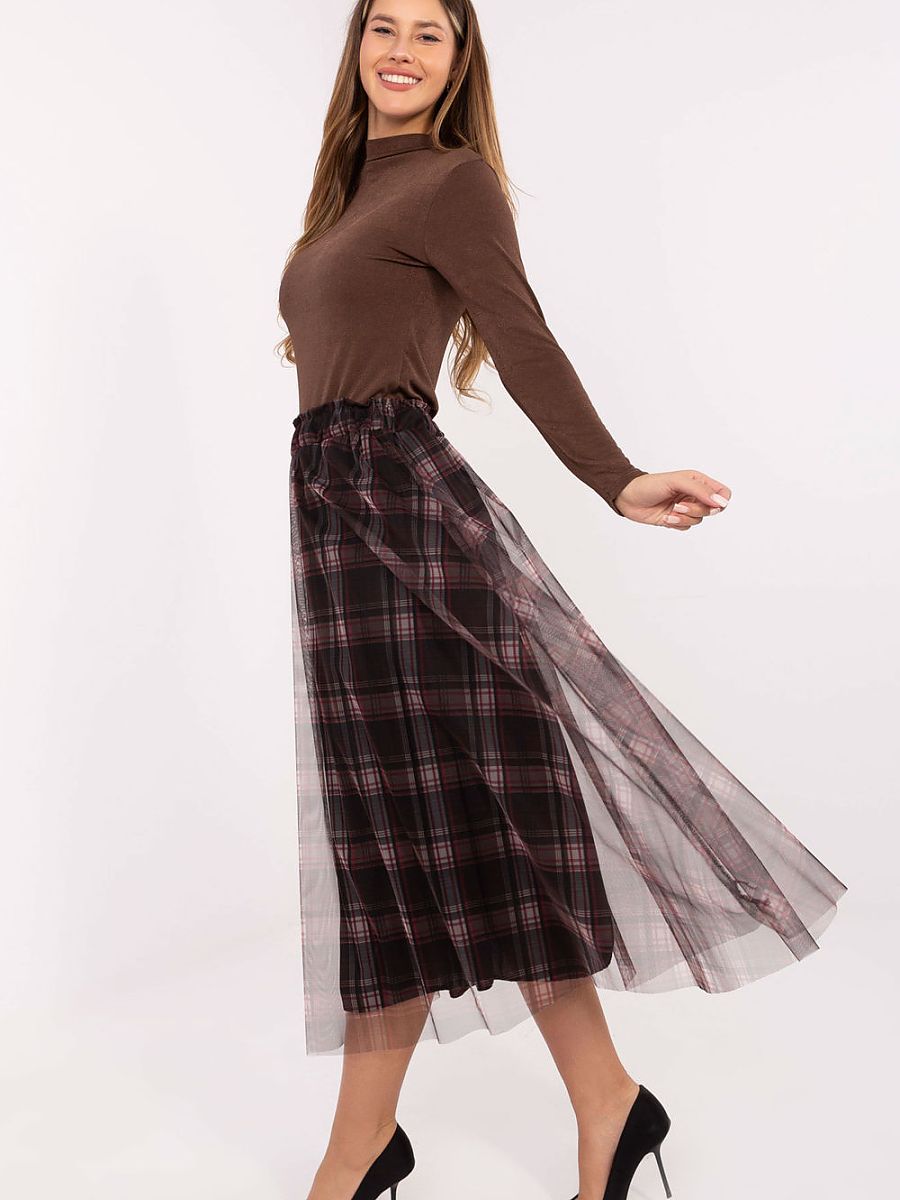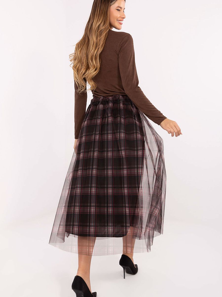 Stylish tulle skirt with a flared cut is a combination of elegance and feminine charm. Made of high-quality polyester and elastane blend, it is light, durable, and comfortable to wear. The model has a lining, which makes it fit nicely and provides full comfort. The checkered pattern gives the skirt a timeless character, while the delicate layer of tulle adds lightness and subtle romanticism. There is an elastic band at the waist, making it easy to put on and perfectly fitting the skirt to the silhouette. The midi-length skirt is perfect for elegant, formal stylizations, as well as more casual or office outfits. It is an ideal choice for women who appreciate style, comfort, and an original look.