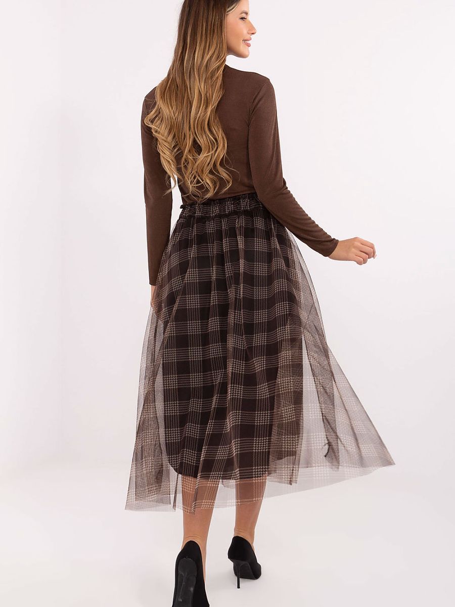 Stylish tulle skirt with a flared cut is a combination of elegance and feminine charm. Made of high-quality polyester and elastane blend, it is light, durable, and comfortable to wear. The model has a lining, which makes it fit perfectly and ensures full comfort. The checked pattern gives the skirt a timeless character, and the delicate layer of tulle adds lightness and subtle romanticism. There is an elastic band in the waist, which makes it easy to put on and perfectly adjusts the skirt to the silhouette. The midi-length skirt will work perfectly in elegant, formal stylings, as well as in more casual or office outfits. It is the perfect choice for women who appreciate style, comfort, and a unique look.