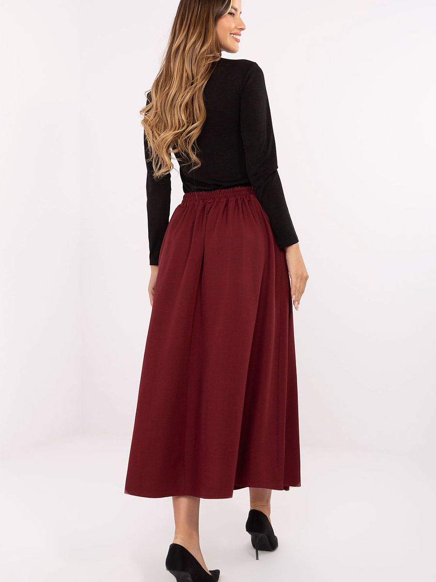 This elegant midi skirt is the perfect combination of classic style and comfort, perfect for everyday wear, work, or more formal occasions. Made of high-quality polyester and elastane blend, it ensures comfort, durability, and beautiful fabric drape. The smooth textured model stands out with a pleated front, adding lightness and feminine character. At the back, there is an inserted elastic band, which allows the skirt to perfectly fit the silhouette and provide comfort throughout the day. Additional advantages are the side pockets and decorative button, subtly emphasizing the elegant style of the model. The lack of fastening makes the skirt extremely practical and easy to put on. It is a versatile wardrobe piece that will work perfectly in office outfits as well as during meetings in a more formal tone.