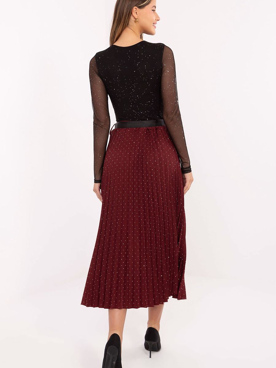 Stylish and feminine pleated midi skirt made of high-quality viscose with elastane, providing lightness, breathability, and comfort when worn. The model has an elastic waistband, which perfectly fits the silhouette and does not require fastening. An additional advantage is the sash belt for tying, which allows you to emphasize the waist and gives the styling an elegant character. The entire surface of the material is adorned with shiny rhinestones, which subtly reflect light, adding a unique charm and elegance to the skirt. This is an excellent proposal for formal occasions, family gatherings, or elegant outings whenever you want to look stylish and classy.