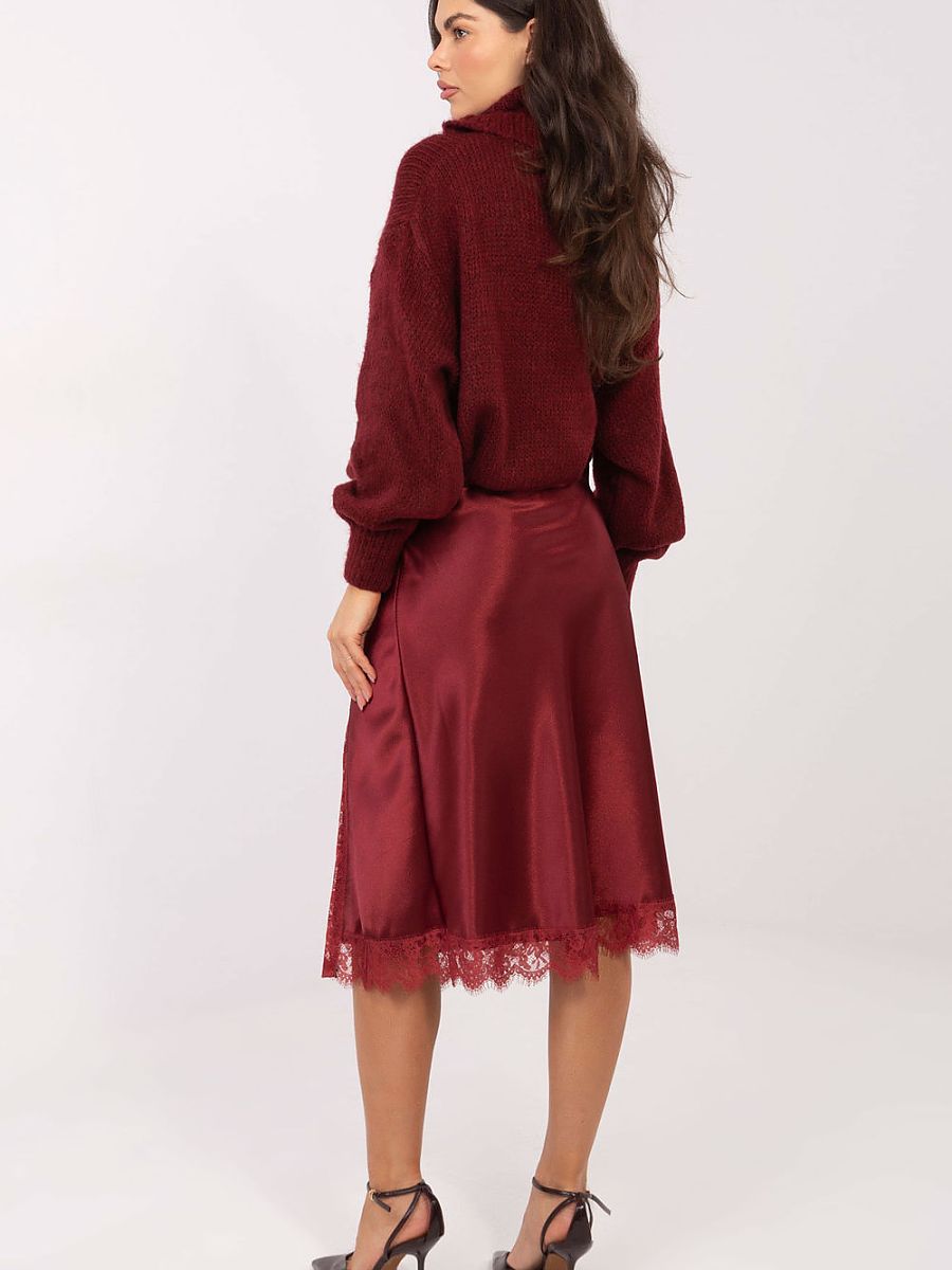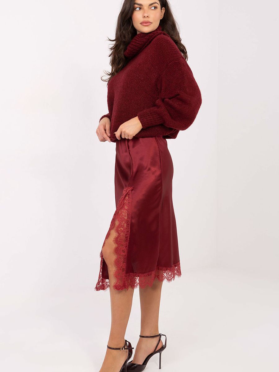 The elegant midi skirt is a stylish model perfect for everyday wear, work, and formal occasions. Made from a combination of polyester and elastane, it provides comfort and perfect fit. The smooth material gives it a timeless, universal character. An elastic band is sewn into the waist, so the skirt fits perfectly and is comfortable to wear, without any fastening. There is a subtle slit at the front, adding lightness and feminine expression to the whole look. The lace finish is a striking accent, giving the skirt elegance and a unique character. This is an excellent choice for women who appreciate a classic style with a delicate, decorative accent.