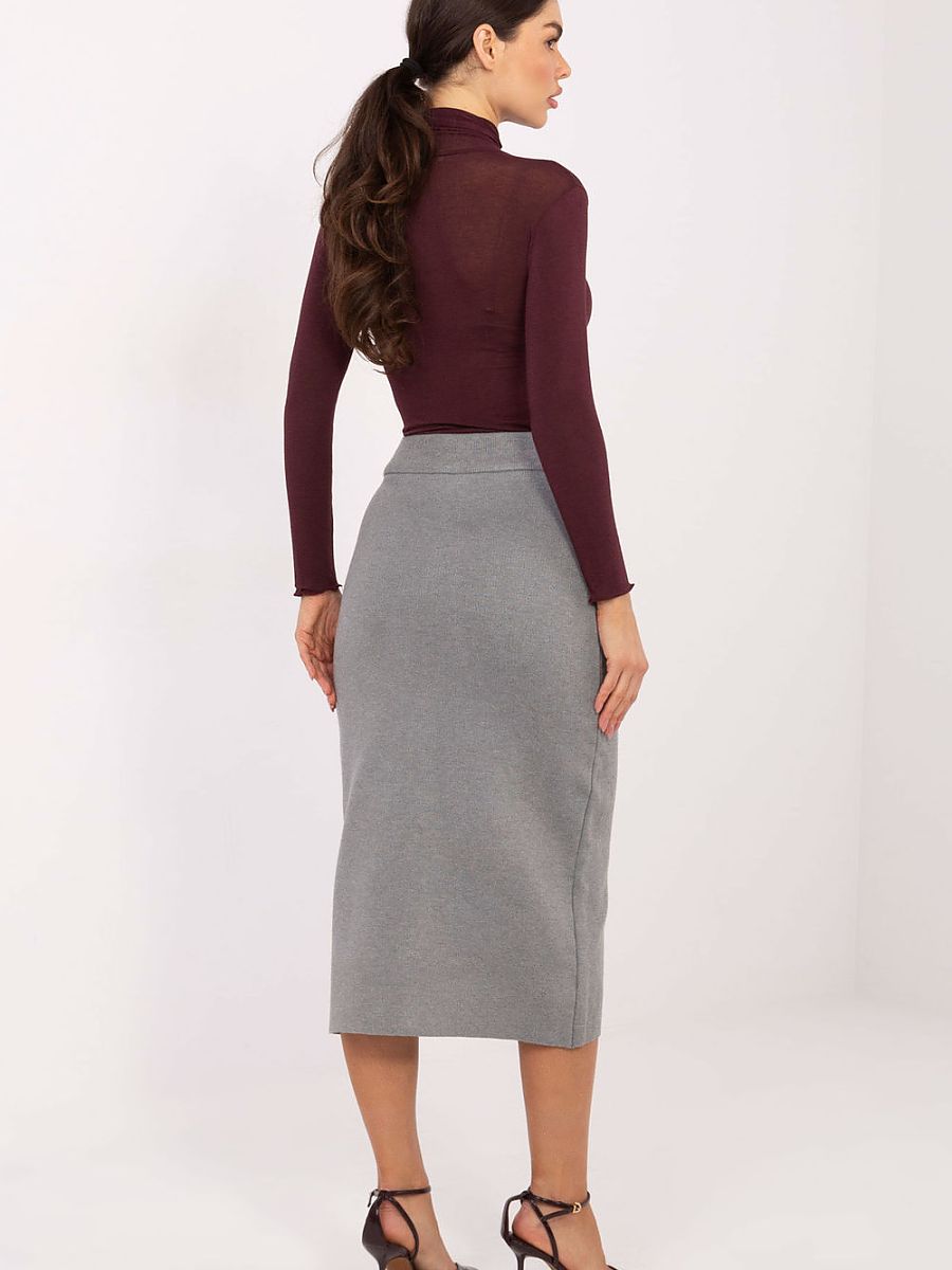 Elegant knit skirt with a smooth pattern, perfect for everyday wear, work, and more formal occasions. Made of high-quality blend of viscose and polyester, it guarantees comfort, softness, and gentle elasticity, perfectly fitting the silhouette. The midi length model presents a timeless, classic style. There is an elastic band in the waist, thanks to which the skirt fits perfectly and provides comfort throughout the day. The lack of fastening makes it extremely practical and easy to put on. Decorative buttons are placed on the front, adding elegance to the whole and subtly enhancing the minimalist cut. This is the perfect choice for women who appreciate the combination of class, comfort, and universal style.
