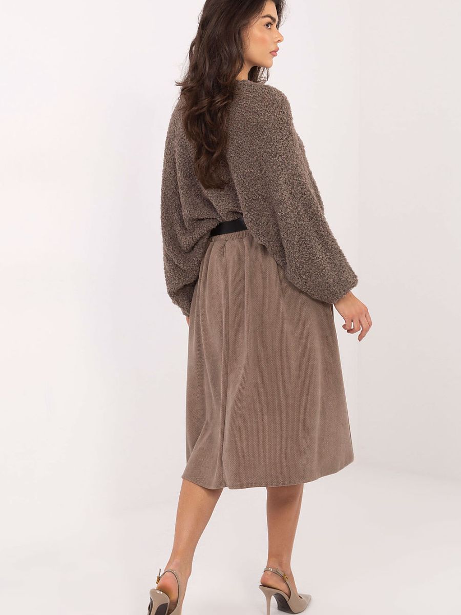 Stylish and feminine flared knit skirt, perfect for everyday wear, work, and more elegant occasions. Made of a blend of polyester and elastane, it provides comfort, flexibility, and beautiful fabric draping. The knit is ribbed, giving the whole a unique, varied texture and subtle character. The skirt is knee-length, making it look tasteful and classic. The lack of a traditional closure makes the model easy to put on and perfectly fits the waist. An additional advantage is the fastened belt, which accentuates the waist and adds an elegant finish. Classic, comfortable, and feminine, an ideal base for many elegant and everyday stylizations.