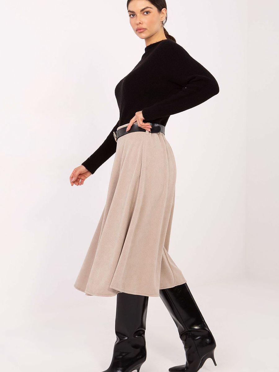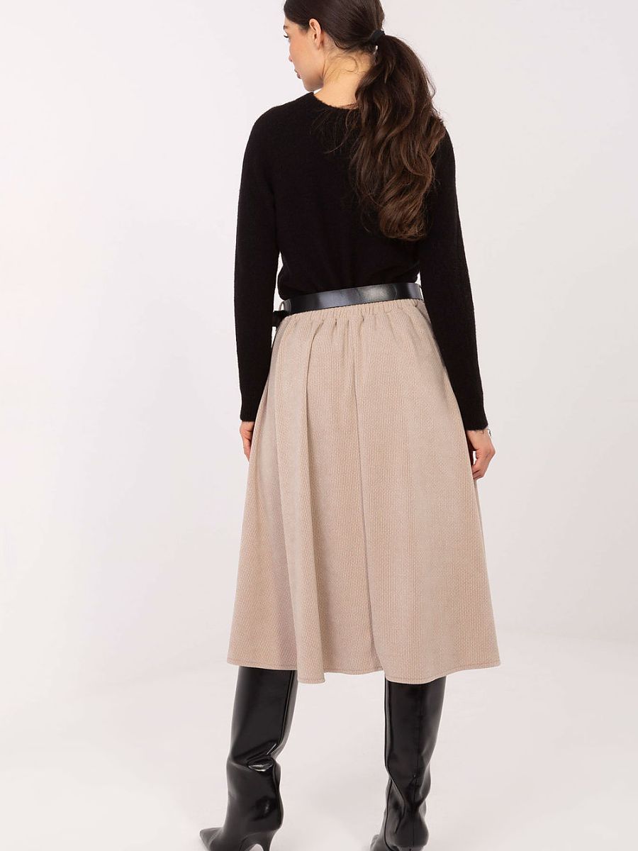Stylish and feminine flared knit skirt, perfect for everyday wear, work, and more elegant occasions. Made of a polyester blend with elastane, it ensures comfort, flexibility, and beautiful fabric draping. The knit fabric is ribbed, giving the whole a unique, varied texture and subtle character. The skirt is knee-length, which makes it look tasteful and classic. The lack of a traditional fastening makes the model easy to put on and perfectly fits the waist. An additional advantage is the fastened belt, which accentuates the waist and adds an elegant finish. Classic, comfortable, and feminine, an ideal base for many elegant and everyday stylizations.