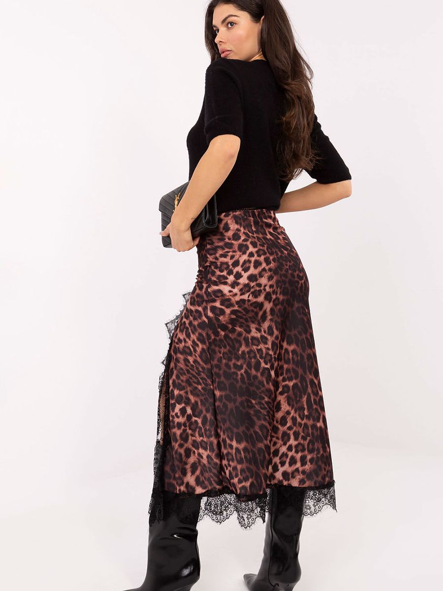 An elegant satin skirt is a stylish proposal that will work perfectly in both everyday stylizations and for formal occasions and work. The eye-catching animal motif gives it a distinctive, fashionable character, emphasizing individual style. The model has an elastic band at the waist, which ensures comfort and perfect fit to the silhouette. The front slit reaching to the thigh subtly exposes the leg, adding feminine lightness and elegance to the whole. The skirt is finished with delicate lace trim, which is a unique, decorative accent. The skirt is made of high-quality polyester, viscose, and elastane blend, making the material lightweight, pleasant to the touch, and slightly elastic. The lack of fastening emphasizes the minimalist form and ease of use.