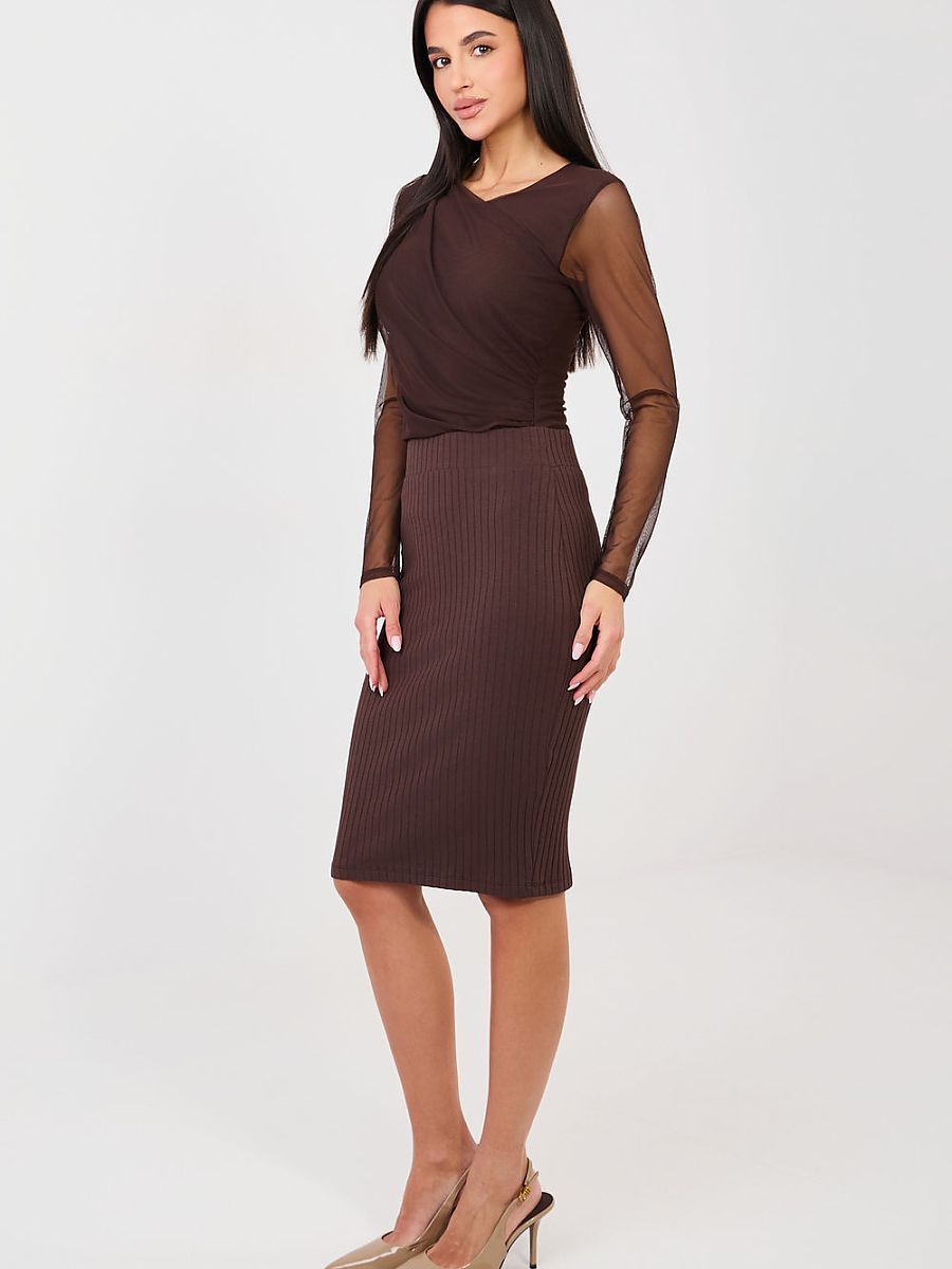 Skirt of midi length, reaching above the knee, made of comfortable ribbed material. A model with a casual character, perfect for both everyday wear and work. An elastic waistband provides comfort and a good fit to the silhouette. The smooth pattern makes the skirt versatile and easy to style with various clothing items. The material, mainly cotton with added elastane, ensures softness, breathability, and freedom of movement. The lack of a fastener highlights the simplicity and functionality of the model.