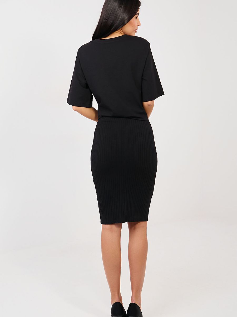 Skirt in midi length, reaching before the knee, made of comfortable ribbed material. A model with a casual character, perfect for both everyday wear and work. An elastic waistband ensures comfort and a good fit to the silhouette. Smooth pattern makes the skirt versatile and easy to style with various wardrobe elements. The material, mainly cotton with a touch of elastane, guarantees softness, breathability, and freedom of movement. Lack of fastening emphasizes the simplicity and functionality of the model.