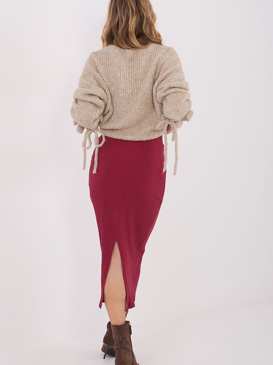 Knitted midi skirt, made of soft, ribbed material ensuring high wearing comfort. A casual style model that will work well in both everyday stylings and as part of a work outfit. The smooth pattern gives it a universal character and makes it easy to combine with various styles of blouses or sweaters. At the back, there is a practical slit at the bottom, which emphasizes the silhouette and provides freedom of movement. The skirt is made of cotton with the addition of elastane, making it elastic, pleasant to the touch, and well-fitting to the figure. The lack of fastening emphasizes the simple, comfortable form of the model.