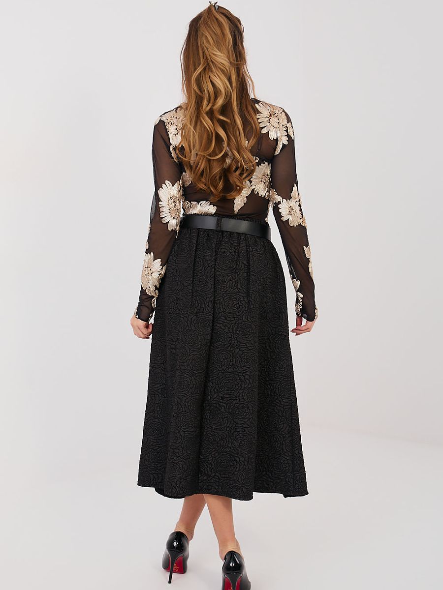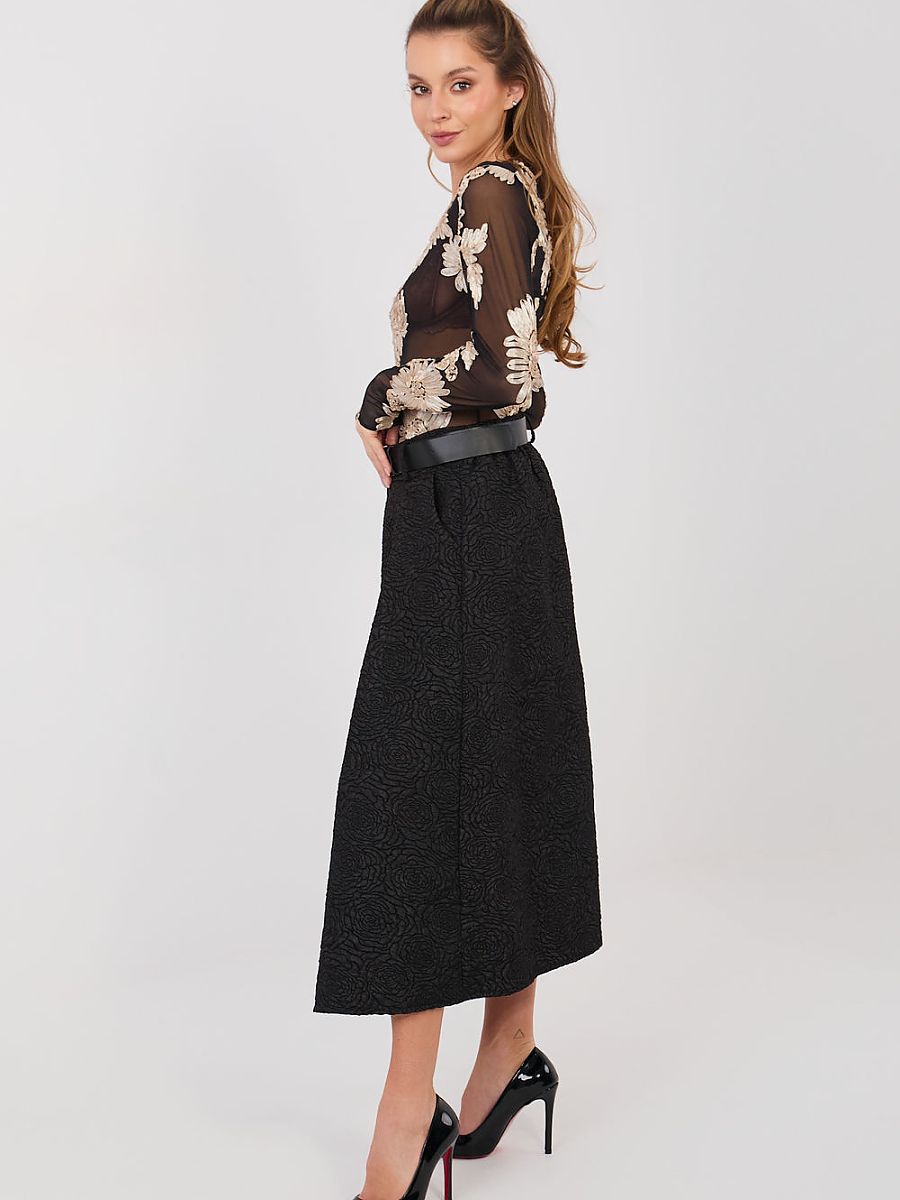 This flared midi skirt is a perfect proposition for women who appreciate elegance combined with comfort. The classic cut beautifully shapes the silhouette, emphasizing the waistline and adding lightness to every movement. An elastic waistband ensures a comfortable fit without the need for fastening. Decorative pleats at the front give the skirt a unique character and subtle volume, while the varied texture of the material and delicate floral pattern introduce a hint of feminine elegance. The model will work perfectly in both formal stylizations and for work with a shirt, blouse, or blazer. Additional advantages are practical, slip pockets and a fastened belt that allows you to emphasize the waist and give the whole look a polished appearance. This is a skirt that combines classic elegance with everyday comfort. Ideal for the office, meetings, and special occasions – always when you want to look stylish and feel comfortable.