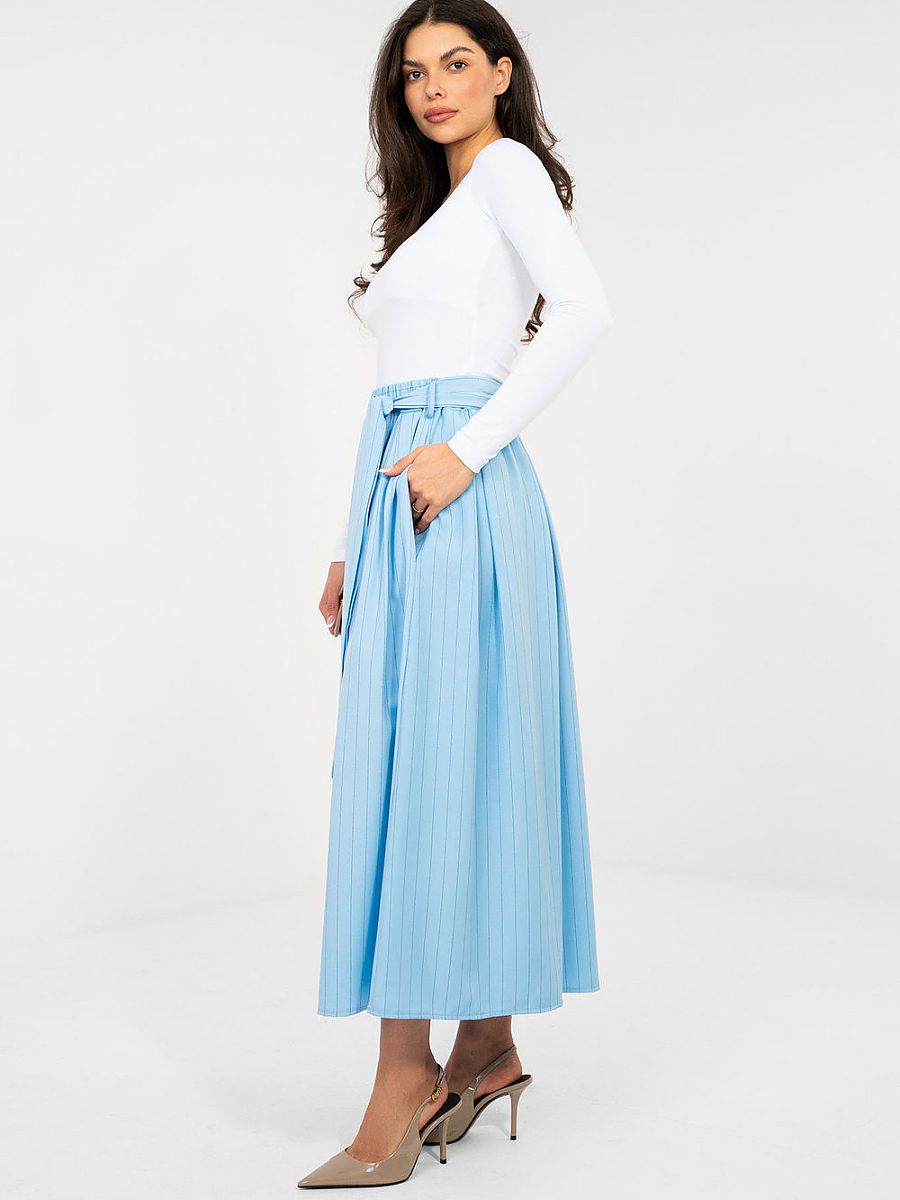 An elegant midi skirt with a flared cut is a perfect choice for women who appreciate classic style with a touch of modernity. The high-waisted model beautifully accentuates the waist, while the elastic waistband ensures a perfect fit and comfort throughout the day. The skirt is made of striped material, which adds a stylish character and visually slims the silhouette. The attached tie belt allows you to further accentuate the waist and give the outfit an individual expression. Practical slip pockets increase the functionality of the model. Made of a blend of polyester, viscose, and elastane, it combines durability with softness and elasticity, guaranteeing comfort and an elegant look in both office and special occasion outfits.